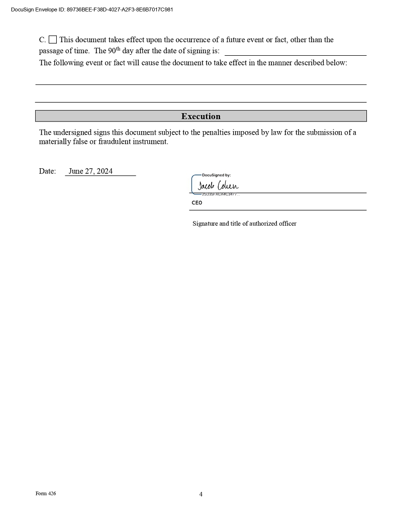 IN WITNESS WHEREOF, the Company has caused this Certificate of Amendment to be signed in its name and on its behalf on this 27th day of June 2024.