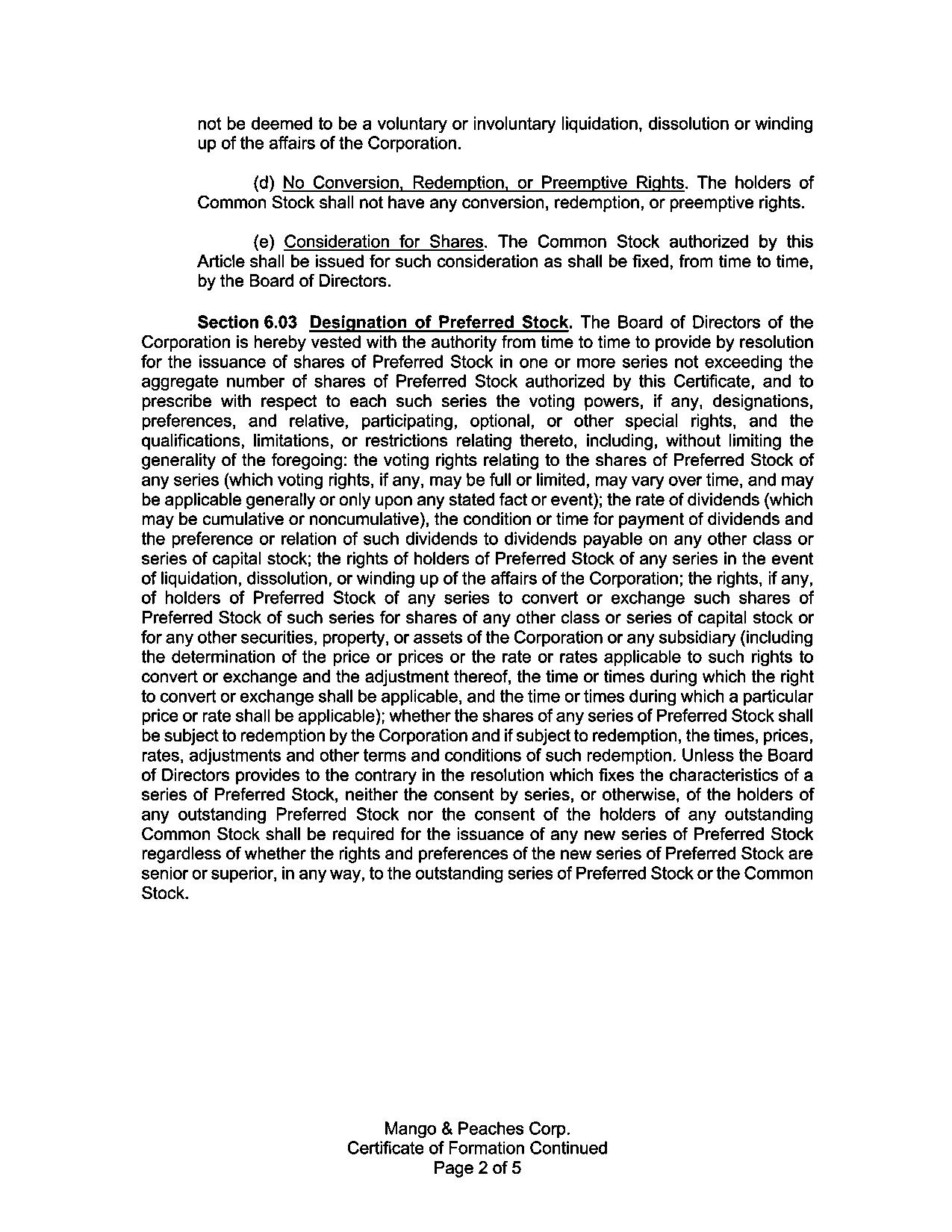 If the shares are to be divided into classes, you must set forth the designation of each class, the number of shares of each class, the par value (or statement of no par value), and the preferences, limitations, and relative rights of each class in the space provided for supplemental information on this form.