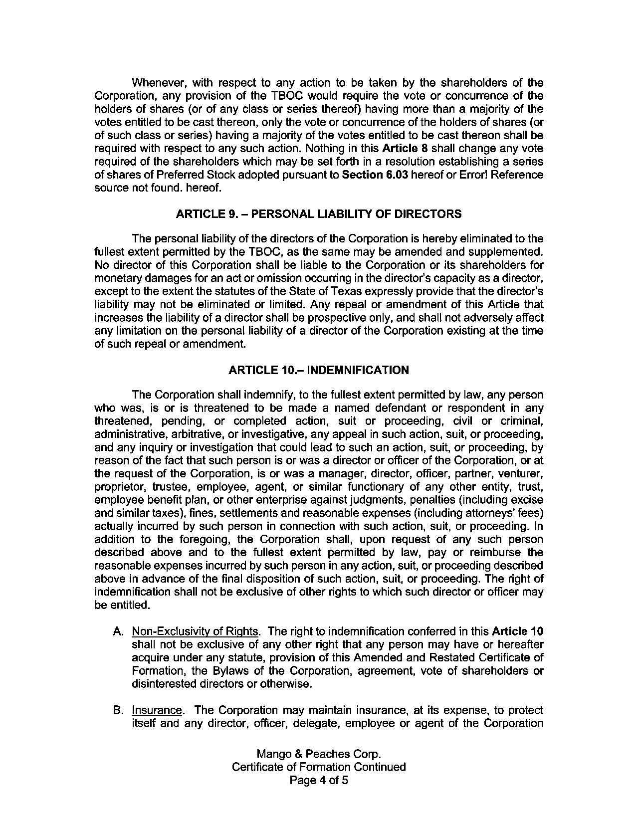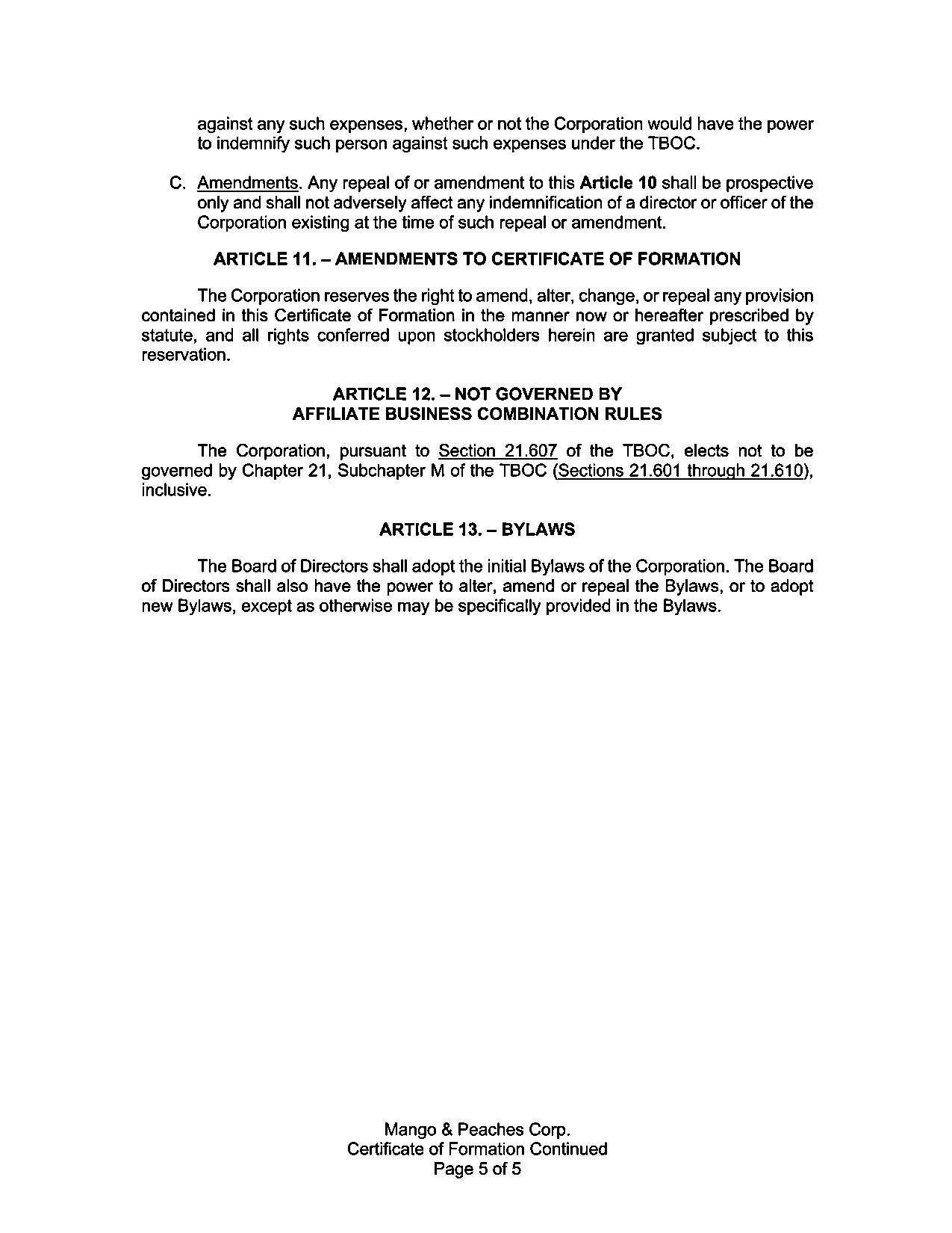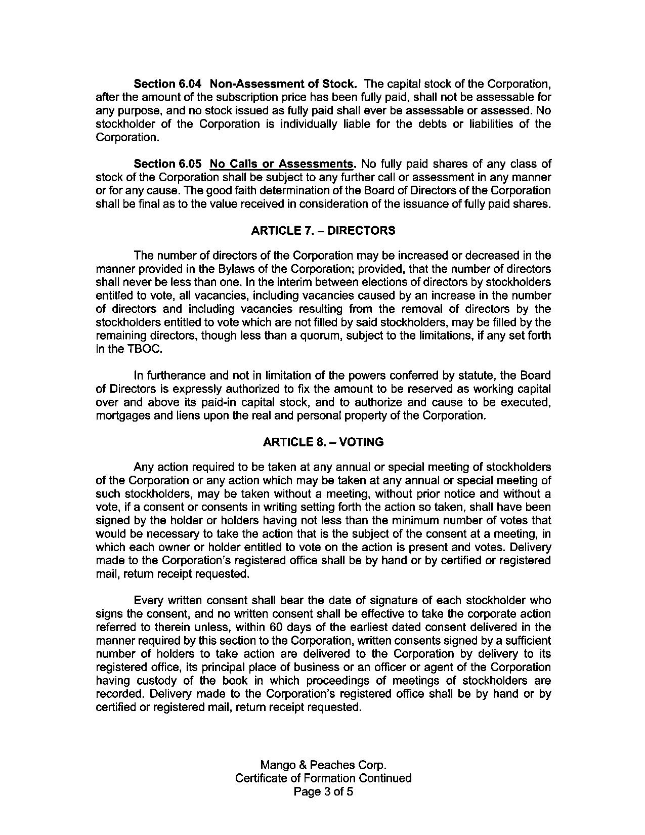 The purpose for which the corporation is formed is for the transaction of any and all lawful business for which a for-profit corporation may be organized under the Texas Business Organizations Code.