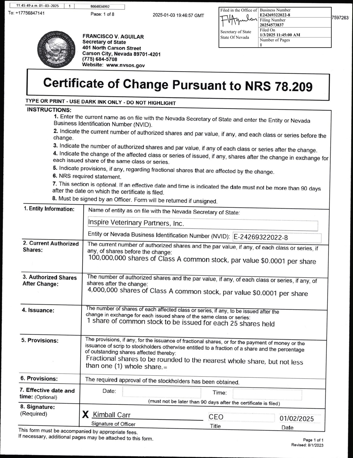 EX-3.1 2 ea022731101ex3-1_inspire.htm CERTIFICATE OF CHANGE TO THE COMPANY'S AMENDED AND RESTATED CERTIFICATE OF INCORPORATION OF INSPIRE VETERINARY PARTNERS, INC., FILED JANUARY 3, 2025
