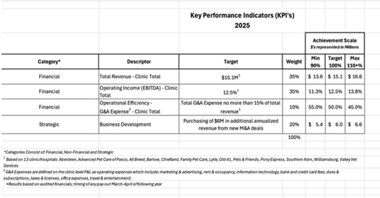 3.2.Short-Term Incentive. Employee shall receive annual performance bonuses (“Bonuses”) at a minimum of 27%, target of 30% and maximum of 37.5% of Employee’s annual salary. Bonuses are determined after the fiscal year end and payable no later than 30 days after the submission of audited annual financials for the plan year. Employee must be employed during the entire fiscal year in order to earn or receive any Bonuses. Company Key Performance Indicators and terms of annual incentive measurement are outlined below: