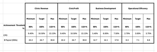 The table below reflects weighted achievement and opportunity for payout at min / target / max per each KPI.
