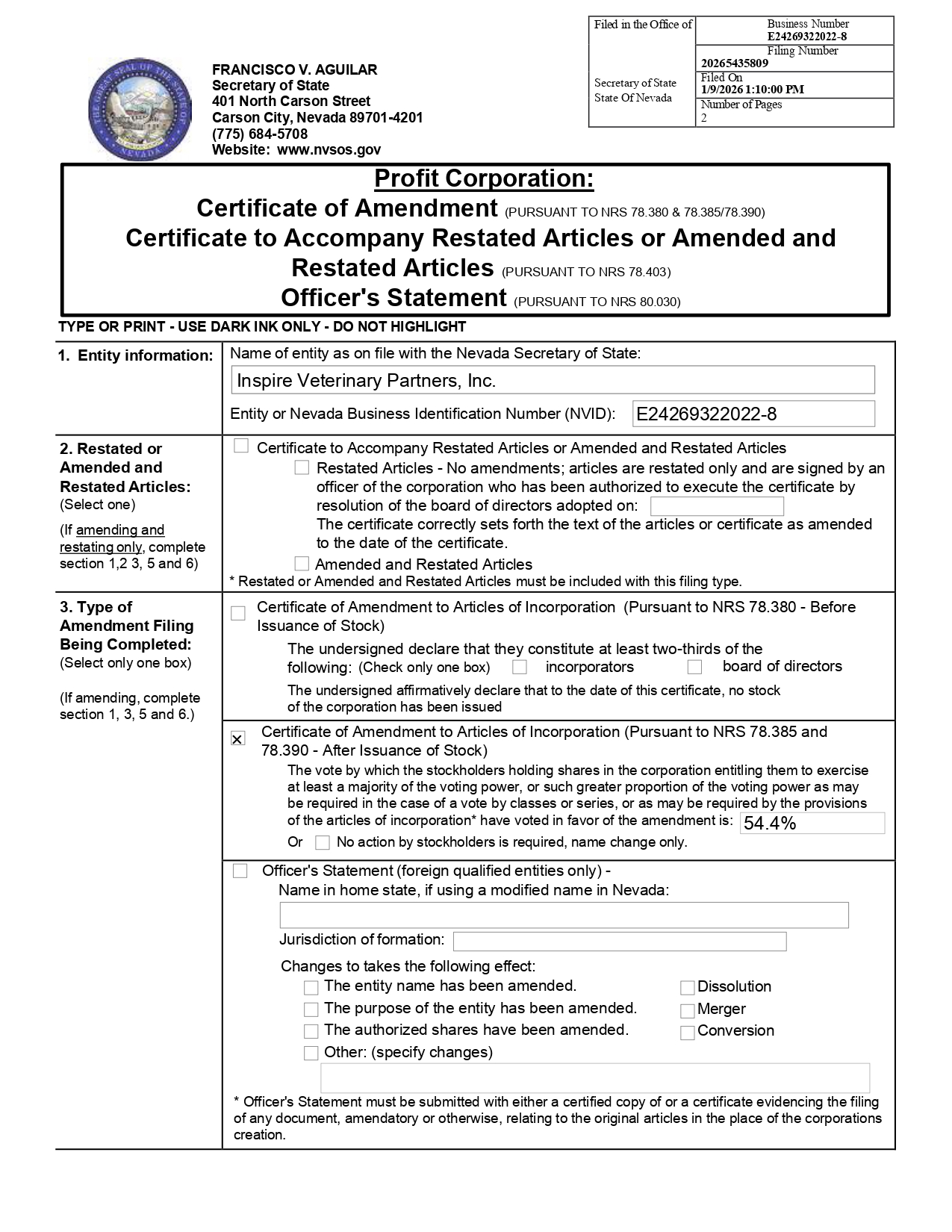 EX-3.1 2 ea027255401ex3-1_inspire.htm CERTIFICATE OF AMENDMENT TO ARTICLES OF INCORPORATION OF INSPIRE VETERINARY PARTNERS, INC. DATED JANUARY 9, 2026