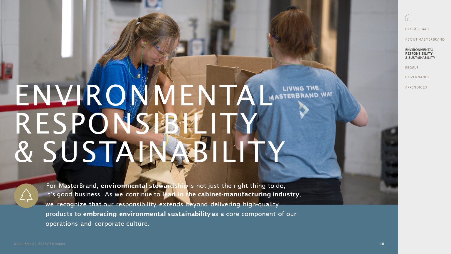 ENVIRONMENTAL RESPONSIBILITY & SUSTAINABILITY  For MasterBrand, environmental stewardship is not just the right thing to do,  it’s good business. As we continue to lead in the cabinet-manufacturing industry, we recognize that our responsibility extends beyond delivering high-quality products to embracing environmental sustainability as a core component of our operations and corporate culture.  APPENDICES  GOVERNANCE  ENVIRONMENTAL  RESPONSIBILITY & SUSTAINABILITY  CEO MESSAGE  ABOUT MASTERBRAND  ENVIRONMENTAL RESPONSIBILITY & SUSTAINABILITY  PEOPLE  MasterBrand | 2023 CSR Report  20