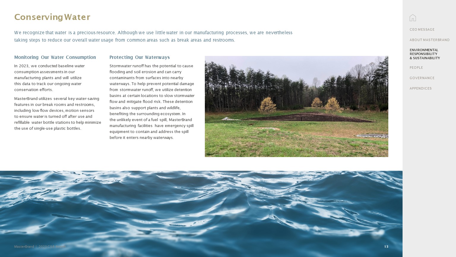 Conserving Water  Monitoring Our Water Consumption  In 2023, we conducted baseline water consumption assessments in our manufacturing plants and will utilize this data to track our ongoing water conservation efforts.  MasterBrand utilizes several key water-saving features in our break rooms and restrooms, including low flow devices, motion sensors  to ensure water is turned off after use and refillable water bottle stations to help minimize the use of single-use plastic bottles.  We recognize that water is a precious resource. Although we use little water in our manufacturing processes, we are nevertheless taking steps to reduce our overall water usage from common areas such as break areas and restrooms.  Protecting Our Waterways  Stormwater runoff has the potential to cause flooding and soil erosion and can carry contaminants from surfaces into nearby waterways. To help prevent potential damage from stormwater runoff, we utilize detention basins at certain locations to slow stormwater flow and mitigate flood risk. These detention basins also support plants and wildlife, benefiting the surrounding ecosystem. In  the unlikely event of a fuel spill, MasterBrand manufacturing facilities have emergency spill equipment to contain and address the spill before it enters nearby waterways.  CEO MESSAGE  ABOUT MASTERBRAND  PEOPLE  APPENDICES  GOVERNANCE  ENVIRONMENTAL  RESPONSIBILITY & SUSTAINABILITY  ENVIRONMENTAL RESPONSIBILITY & SUSTAINABILITY  MasterBrand | 2023 CSR Report  20