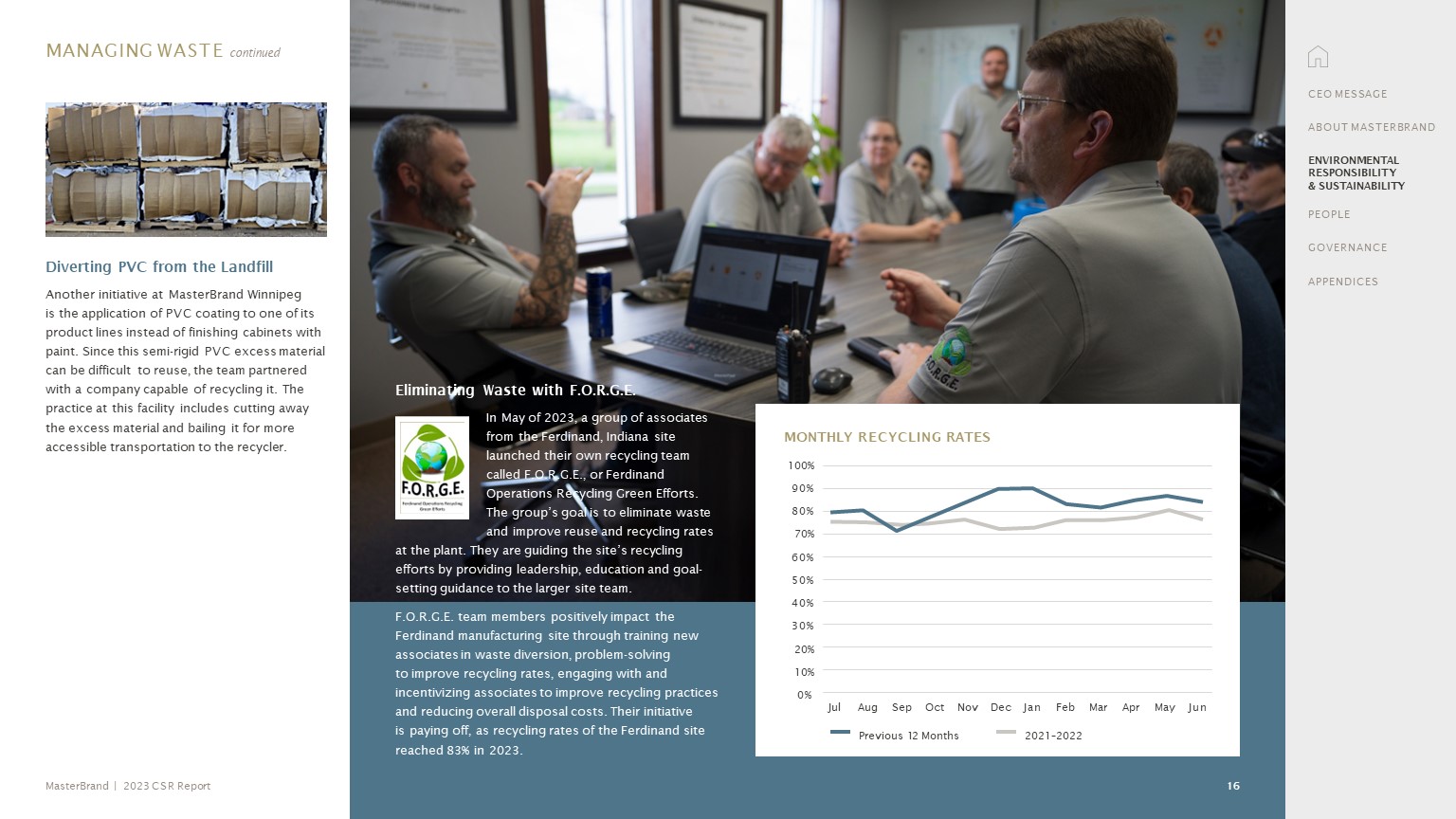 MANAGING WASTE continued  Eliminating Waste with F.O.R.G.E.  In May of 2023, a group of associates from the Ferdinand, Indiana site launched their own recycling team called F.O.R.G.E., or Ferdinand Operations Recycling Green Efforts. The group’s goal is to eliminate waste and improve reuse and recycling rates  at the plant. They are guiding the site’s recycling efforts by providing leadership, education and goal- setting guidance to the larger site team.  F.O.R.G.E. team members positively impact the Ferdinand manufacturing site through training new associates in waste diversion, problem-solving  to improve recycling rates, engaging with and incentivizing associates to improve recycling practices and reducing overall disposal costs. Their initiative  is paying off, as recycling rates of the Ferdinand site reached 83% in 2023.  MONTHLY RECYCLING RATES  100%  90%  80%  70%  60%  50%  40%  30%  20%  10%  0%  Jul Aug Sep Oct Nov Dec Jan Feb Mar Apr May Jun  Previous 12 Months 2021–2022  Diverting PVC from the Landfill  Another initiative at MasterBrand Winnipeg is the application of PVC coating to one of its  product lines instead of finishing cabinets with paint. Since this semi-rigid PVC excess material can be difficult to reuse, the team partnered with a company capable of recycling it. The practice at this facility includes cutting away the excess material and bailing it for more accessible transportation to the recycler.  APPENDICES  ENVIRONMENTAL  RESPONSIBILITY & SUSTAINABILITY  CEO MESSAGE  ABOUT MASTERBRAND  ENVIRONMENTAL RESPONSIBILITY & SUSTAINABILITY  PEOPLE GOVERNANCE  MasterBrand | 2023 CSR Report  20