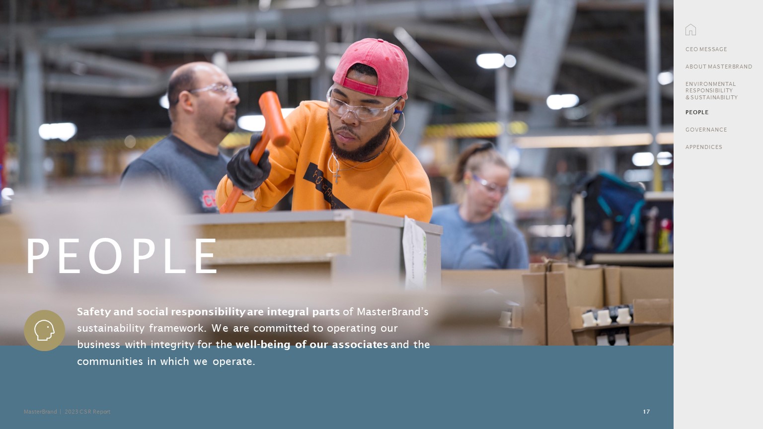PEOPLE  Safety and social responsibility are integral parts of MasterBrand’s sustainability framework. We are committed to operating our business with integrity for the well-being of our associates and the communities in which we operate.  PEOPLE  CEO MESSAGE  ABOUT MASTERBRAND  ENVIRONMENTAL RESPONSIBILITY & SUSTAINABILITY  PEOPLE GOVERNANCE APPENDICES  MasterBrand | 2023 CSR Report  20