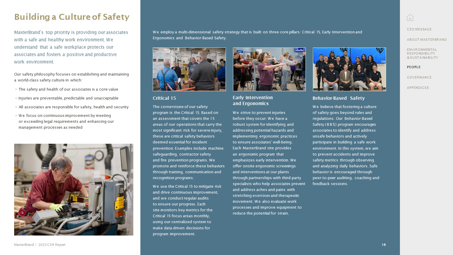 Critical 15  The cornerstone of our safety program is the Critical 15. Based on an assessment that covers the 15 areas of our operations that carry the most significant risk for severe injury, these are critical safety behaviors deemed essential for incident  prevention. Examples include machine safeguarding, contractor safety  and fire prevention programs. We promote and reinforce these behaviors through training, communication and recognition programs.  We use the Critical 15 to mitigate risk and drive continuous improvement, and we conduct regular audits  to ensure our progress. Each site monitors key metrics for the Critical 15 focus areas monthly, using our centralized system to make data-driven decisions for program improvement.  MasterBrand’s top priority is providing our associates with a safe and healthy work environment. We understand that a safe workplace protects our associates and fosters a positive and productive work environment.  Our safety philosophy focuses on establishing and maintaining a world-class safety culture in which:  The safety and health of our associates is a core value  Injuries are preventable, predictable and unacceptable  All associates are responsible for safety, health and security  We focus on continuous improvement by meeting or exceeding legal requirements and enhancing our management processes as needed  Early Intervention and Ergonomics  We strive to prevent injuries before they occur. We have a robust system for identifying and addressing potential hazards and implementing ergonomic practices to ensure associates’ well-being.  Each MasterBrand site provides an ergonomic program that emphasizes early intervention. We offer onsite ergonomic screenings and interventions at our plants  through partnerships with third-party specialists who help associates prevent and address aches and pains with stretching exercises and therapeutic movement. We also evaluate work processes and improve equipment to reduce the potential for strain.  Behavior-Based Safety  We believe that fostering a culture of safety goes beyond rules and regulations. Our Behavior-Based Safety (BBS) program encourages associates to identify and address unsafe behaviors and actively participate in building a safe work environment. In this system, we aim to prevent accidents and improve safety metrics through observing and analyzing daily behaviors. Safe behavior is encouraged through peer-to-peer auditing, coaching and feedback sessions.  Building a Culture of Safety  We employ a multi-dimensional safety strategy that is built on three core pillars: Critical 15, Early Intervention and Ergonomics and Behavior-Based Safety.  CEO MESSAGE  ABOUT MASTERBRAND  PEOPLE  APPENDICES  GOVERNANCE  ENVIRONMENTAL RESPONSIBILITY & SUSTAINABILITY  PEOPLE  MasterBrand | 2023 CSR Report  20