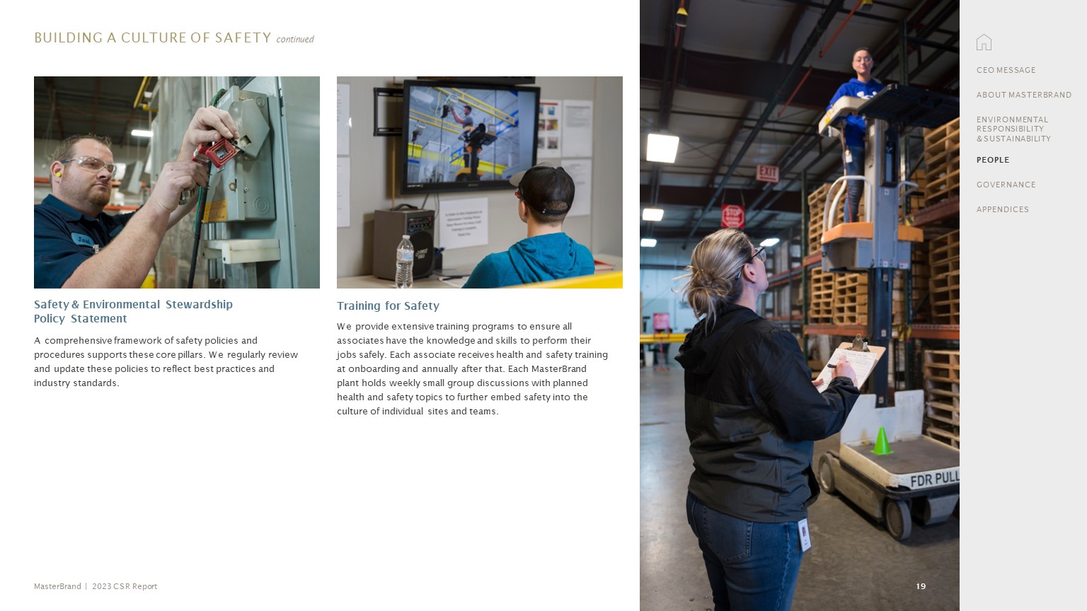 BUILDING A CULTURE OF SAFETY continued  Training for Safety  We provide extensive training programs to ensure all associates have the knowledge and skills to perform their jobs safely. Each associate receives health and safety training at onboarding and annually after that. Each MasterBrand plant holds weekly small group discussions with planned health and safety topics to further embed safety into the culture of individual sites and teams.  Safety & Environmental Stewardship Policy Statement  A comprehensive framework of safety policies and procedures supports these core pillars. We regularly review and update these policies to reflect best practices and industry standards.  PEOPLE  CEO MESSAGE  ABOUT MASTERBRAND  ENVIRONMENTAL RESPONSIBILITY & SUSTAINABILITY  PEOPLE GOVERNANCE APPENDICES  MasterBrand | 2023 CSR Report  20