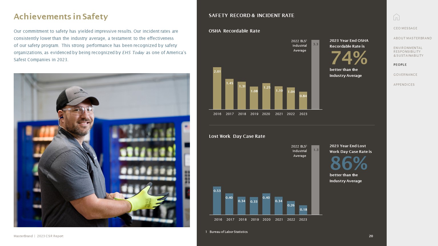Achievements in Safety  1.08  0.33  1.45  0.40  1.10  0.34  2.01  0.53  1.25  0.40  1.31  0.34  1.04  0.84  0.26  0.18  3.3  1.3  2016 2017 2018 2019 2020 2021 2022 2023  2022 BLS1  Industrial Average  2022 BLS1  Industrial Average  OSHA Recordable Rate  Lost Work Day Case Rate  2023 Year End OSHA Recordable Rate is  74%  better than the  Industry Average  2023 Year End Lost Work Day Case Rate is  86%  better than the  Industry Average  Our commitment to safety has yielded impressive results. Our incident rates are consistently lower than the industry average, a testament to the effectiveness of our safety program. This strong performance has been recognized by safety  organizations, as evidenced by being recognized by EHS Today as one of America’s Safest Companies in 2023.  SAFETY RECORD & INCIDENT RATE  2016 2017 2018 2019 2020 2021 2022 2023  1 Bureau of Labor Statistics  CEO MESSAGE  ABOUT MASTERBRAND  PEOPLE  APPENDICES  GOVERNANCE  ENVIRONMENTAL RESPONSIBILITY & SUSTAINABILITY  PEOPLE  MasterBrand | 2023 CSR Report  20