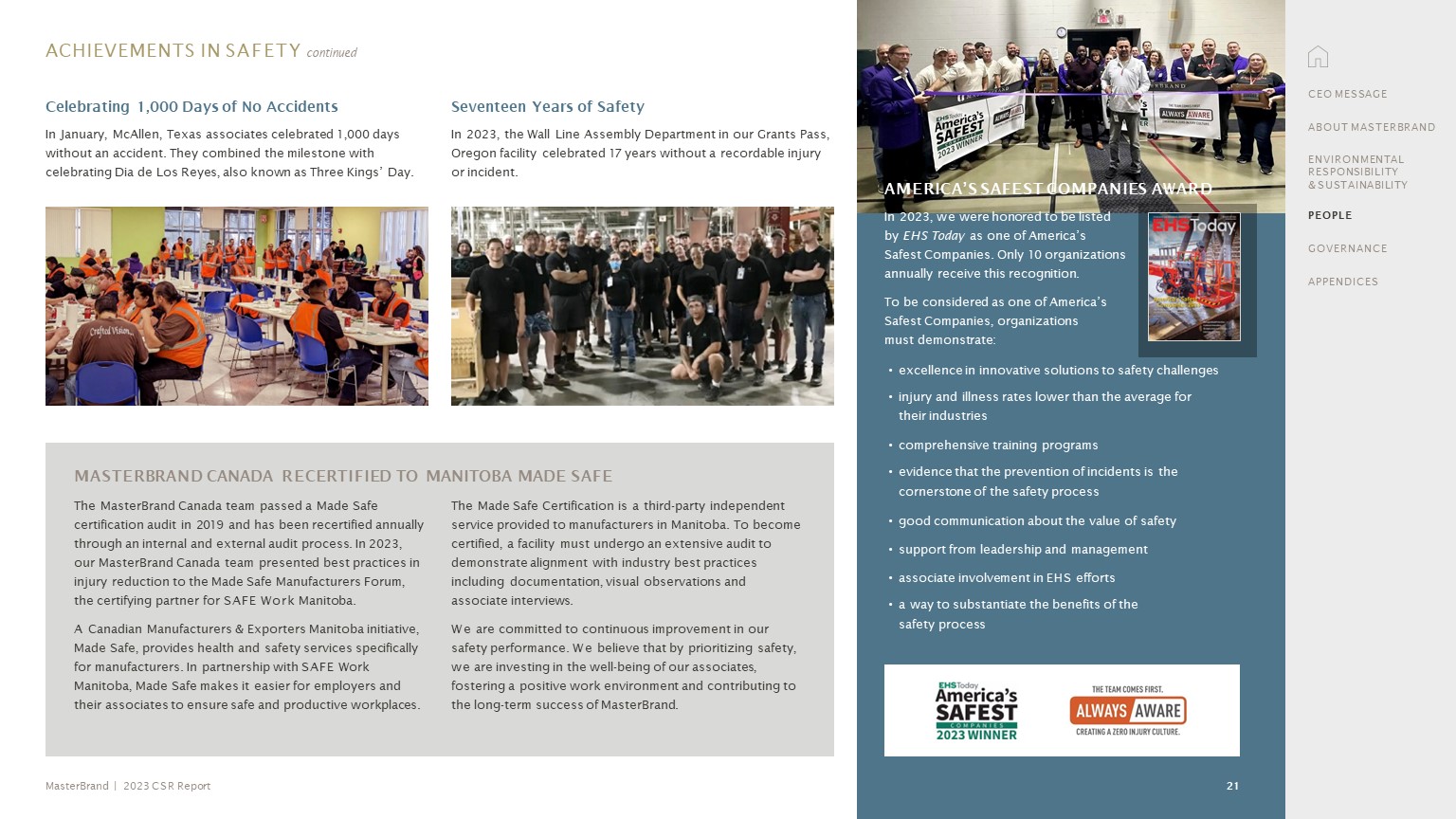 MASTERBRAND CANADA RECERTIFIED TO MANITOBA MADE SAFE  AMERICA’S SAFEST COMPANIES AWARD  In 2023, we were honored to be listed by EHS Today as one of America’s Safest Companies. Only 10 organizations annually receive this recognition.  To be considered as one of America’s Safest Companies, organizations must demonstrate:  excellence in innovative solutions to safety challenges  injury and illness rates lower than the average for their industries  comprehensive training programs  evidence that the prevention of incidents is the cornerstone of the safety process  good communication about the value of safety  support from leadership and management  associate involvement in EHS efforts  a way to substantiate the benefits of the safety process  ACHIEVEMENTS IN SAFETY continued  Celebrating 1,000 Days of No Accidents  In January, McAllen, Texas associates celebrated 1,000 days without an accident. They combined the milestone with celebrating Dia de Los Reyes, also known as Three Kings’ Day.  Seventeen Years of Safety  In 2023, the Wall Line Assembly Department in our Grants Pass, Oregon facility celebrated 17 years without a recordable injury or incident.  The MasterBrand Canada team passed a Made Safe certification audit in 2019 and has been recertified annually through an internal and external audit process. In 2023, our MasterBrand Canada team presented best practices in injury reduction to the Made Safe Manufacturers Forum, the certifying partner for SAFE Work Manitoba.  A Canadian Manufacturers & Exporters Manitoba initiative, Made Safe, provides health and safety services specifically for manufacturers. In partnership with SAFE Work Manitoba, Made Safe makes it easier for employers and their associates to ensure safe and productive workplaces.  The Made Safe Certification is a third-party independent service provided to manufacturers in Manitoba. To become certified, a facility must undergo an extensive audit to demonstrate alignment with industry best practices including documentation, visual observations and associate interviews.  We are committed to continuous improvement in our safety performance. We believe that by prioritizing safety, we are investing in the well-being of our associates, fostering a positive work environment and contributing to the long-term success of MasterBrand.  CEO MESSAGE  ABOUT MASTERBRAND  PEOPLE  APPENDICES  GOVERNANCE  ENVIRONMENTAL RESPONSIBILITY & SUSTAINABILITY  PEOPLE  MasterBrand | 2023 CSR Report  20