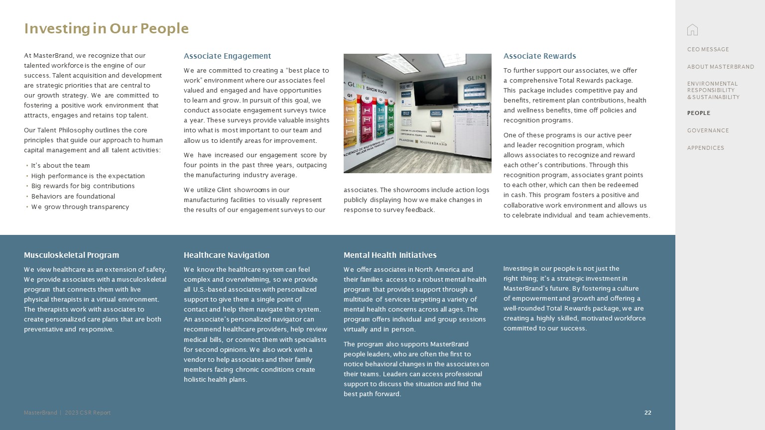 At MasterBrand, we recognize that our talented workforce is the engine of our success. Talent acquisition and development are strategic priorities that are central to  our growth strategy. We are committed to fostering a positive work environment that attracts, engages and retains top talent.  Our Talent Philosophy outlines the core principles that guide our approach to human capital management and all talent activities:  It’s about the team  High performance is the expectation  Big rewards for big contributions  Behaviors are foundational  We grow through transparency  Investing in Our People  Musculoskeletal Program  We view healthcare as an extension of safety. We provide associates with a musculoskeletal program that connects them with live physical therapists in a virtual environment.  The therapists work with associates to create personalized care plans that are both preventative and responsive.  Healthcare Navigation  We know the healthcare system can feel complex and overwhelming, so we provide all U.S.-based associates with personalized support to give them a single point of contact and help them navigate the system.  An associate’s personalized navigator can recommend healthcare providers, help review medical bills, or connect them with specialists for second opinions. We also work with a vendor to help associates and their family members facing chronic conditions create holistic health plans.  Mental Health Initiatives  We offer associates in North America and their families access to a robust mental health program that provides support through a multitude of services targeting a variety of mental health concerns across all ages. The program offers individual and group sessions virtually and in person.  The program also supports MasterBrand people leaders, who are often the first to notice behavioral changes in the associates on their teams. Leaders can access professional support to discuss the situation and find the best path forward.  Investing in our people is not just the right thing; it’s a strategic investment in  MasterBrand’s future. By fostering a culture of empowerment and growth and offering a well-rounded Total Rewards package, we are creating a highly skilled, motivated workforce committed to our success.  Associate Engagement  We are committed to creating a “best place to work” environment where our associates feel valued and engaged and have opportunities to learn and grow. In pursuit of this goal, we conduct associate engagement surveys twice a year. These surveys provide valuable insights into what is most important to our team and allow us to identify areas for improvement.  We have increased our engagement score by four points in the past three years, outpacing the manufacturing industry average.  We utilize Glint showrooms in our manufacturing facilities to visually represent the results of our engagement surveys to our  associates. The showrooms include action logs publicly displaying how we make changes in response to survey feedback.  Associate Rewards  To further support our associates, we offer a comprehensive Total Rewards package.  This package includes competitive pay and benefits, retirement plan contributions, health and wellness benefits, time off policies and recognition programs.  One of these programs is our active peer and leader recognition program, which allows associates to recognize and reward each other’s contributions. Through this recognition program, associates grant points to each other, which can then be redeemed in cash. This program fosters a positive and  collaborative work environment and allows us to celebrate individual and team achievements.  CEO MESSAGE  ABOUT MASTERBRAND  PEOPLE  APPENDICES  GOVERNANCE  ENVIRONMENTAL RESPONSIBILITY & SUSTAINABILITY  PEOPLE  MasterBrand | 2023 CSR Report  20