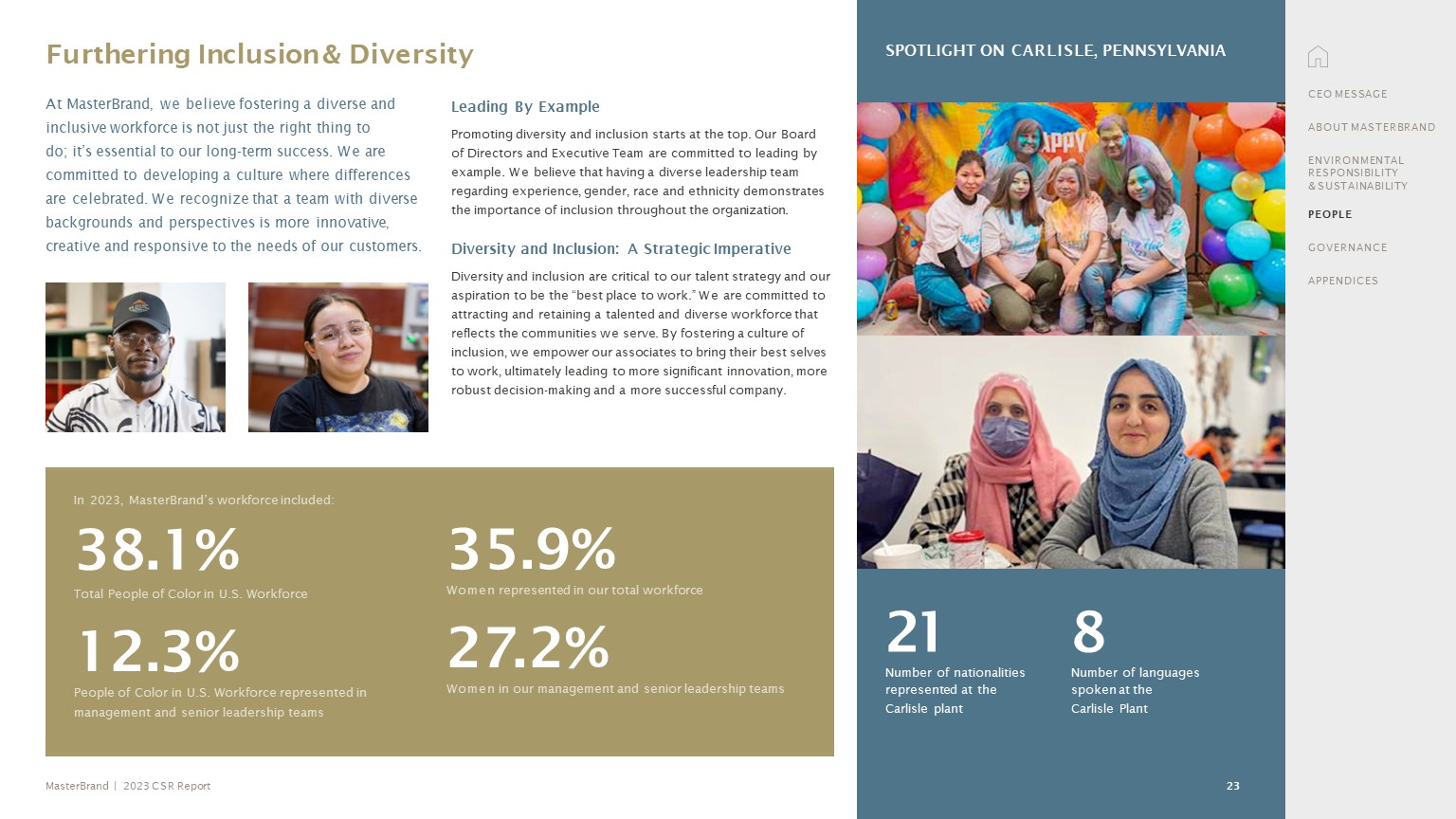 In 2023, MasterBrand’s workforce included:  38.1%  Total People of Color in U.S. Workforce  SPOTLIGHT ON CARLISLE, PENNSYLVANIA  Furthering Inclusion & Diversity  At MasterBrand, we believe fostering a diverse and inclusive workforce is not just the right thing to do; it’s essential to our long-term success. We are  committed to developing a culture where differences are celebrated. We recognize that a team with diverse backgrounds and perspectives is more innovative, creative and responsive to the needs of our customers.  Leading By Example  Promoting diversity and inclusion starts at the top. Our Board of Directors and Executive Team are committed to leading by example. We believe that having a diverse leadership team regarding experience, gender, race and ethnicity demonstrates the importance of inclusion throughout the organization.  Diversity and Inclusion: A Strategic Imperative  Diversity and inclusion are critical to our talent strategy and our aspiration to be the “best place to work.” We are committed to attracting and retaining a talented and diverse workforce that reflects the communities we serve. By fostering a culture of inclusion, we empower our associates to bring their best selves to work, ultimately leading to more significant innovation, more robust decision-making and a more successful company.  21  Number of nationalities  represented at the Carlisle plant  8  Number of languages  spoken at the Carlisle Plant  12.3%  People of Color in U.S. Workforce represented in  management and senior leadership teams  35.9%  Women represented in our total workforce  27.2%  Women in our management and senior leadership teams  PEOPLE  CEO MESSAGE  ABOUT MASTERBRAND  ENVIRONMENTAL RESPONSIBILITY & SUSTAINABILITY  PEOPLE GOVERNANCE APPENDICES  MasterBrand | 2023 CSR Report  20