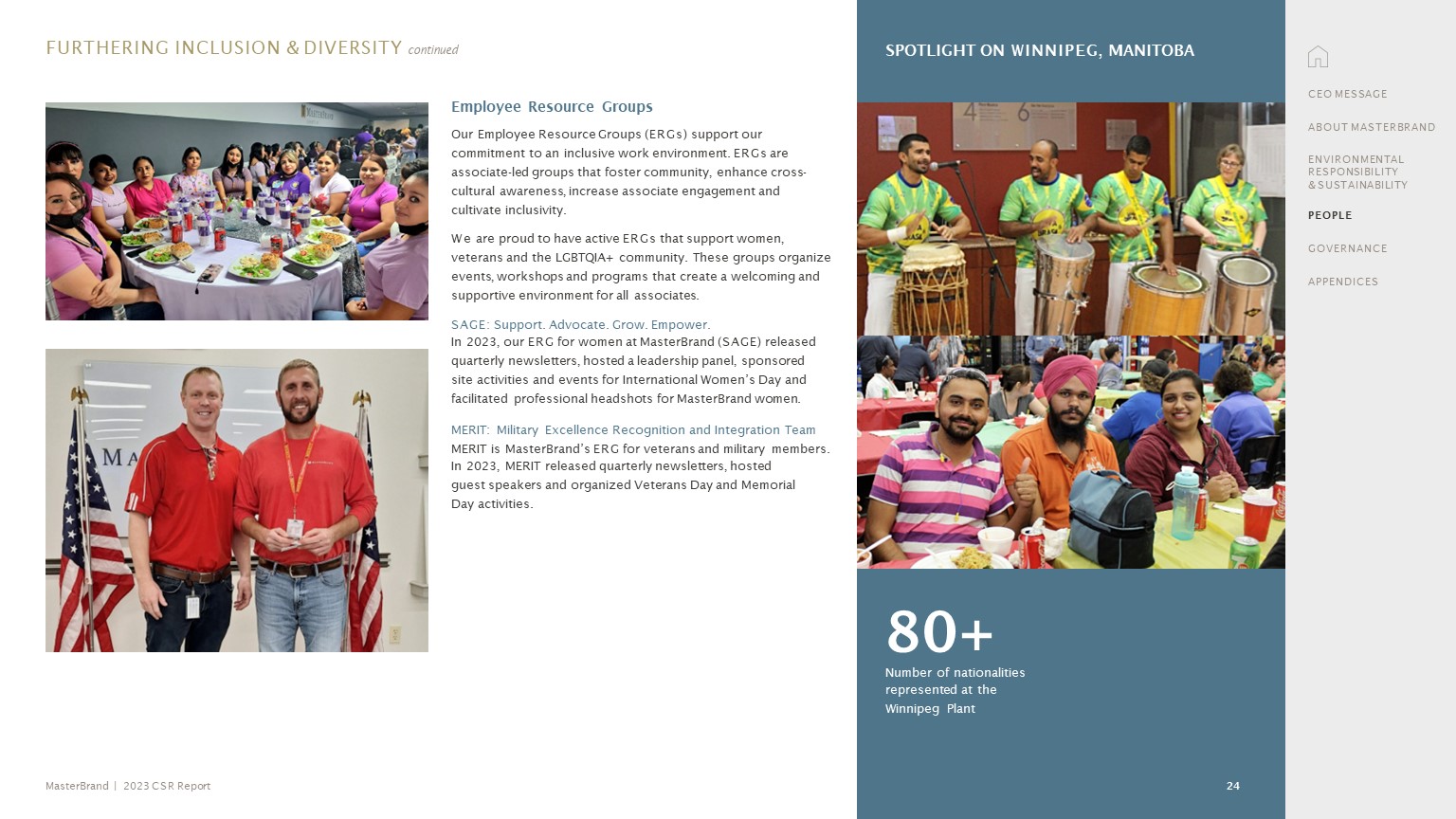 FURTHERING INCLUSION & DIVERSITY continued  Employee Resource Groups  Our Employee Resource Groups (ERGs) support our commitment to an inclusive work environment. ERGs are associate-led groups that foster community, enhance cross- cultural awareness, increase associate engagement and cultivate inclusivity.  We are proud to have active ERGs that support women, veterans and the LGBTQIA+ community. These groups organize events, workshops and programs that create a welcoming and supportive environment for all associates.  SAGE: Support. Advocate. Grow. Empower.  In 2023, our ERG for women at MasterBrand (SAGE) released quarterly newsletters, hosted a leadership panel, sponsored site activities and events for International Women’s Day and facilitated professional headshots for MasterBrand women.  MERIT: Military Excellence Recognition and Integration Team  MERIT is MasterBrand’s ERG for veterans and military members.  In 2023, MERIT released quarterly newsletters, hosted guest speakers and organized Veterans Day and Memorial Day activities.  SPOTLIGHT ON WINNIPEG, MANITOBA  80+  Number of nationalities  represented at the Winnipeg Plant  CEO MESSAGE  ABOUT MASTERBRAND  PEOPLE  APPENDICES  GOVERNANCE  ENVIRONMENTAL RESPONSIBILITY & SUSTAINABILITY  PEOPLE  MasterBrand | 2023 CSR Report  20