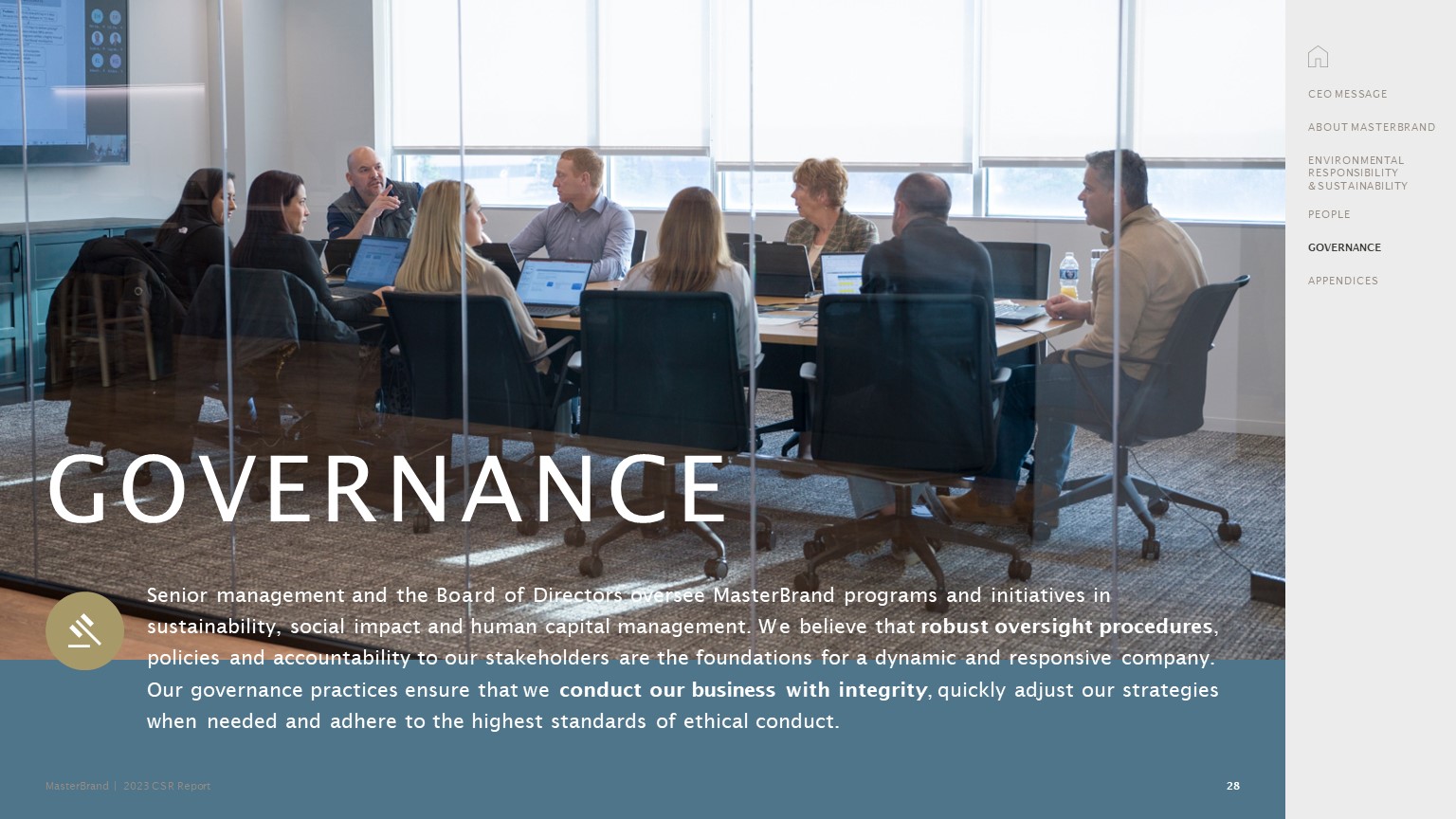 GOVERNANCE  Senior management and the Board of Directors oversee MasterBrand programs and initiatives in sustainability, social impact and human capital management. We believe that robust oversight procedures, policies and accountability to our stakeholders are the foundations for a dynamic and responsive company. Our governance practices ensure that we conduct our business with integrity, quickly adjust our strategies when needed and adhere to the highest standards of ethical conduct.  GOVERNANCE  CEO MESSAGE  ABOUT MASTERBRAND  ENVIRONMENTAL RESPONSIBILITY & SUSTAINABILITY  PEOPLE GOVERNANCE APPENDICES  MasterBrand | 2023 CSR Report  20