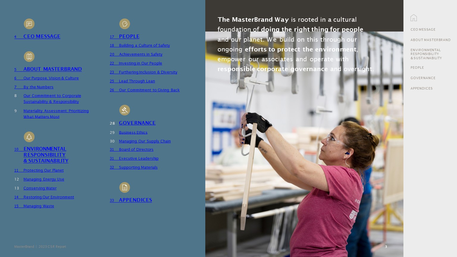 The MasterBrand Way is rooted in a cultural foundation of doing the right thing for people and our planet. We build on this through our ongoing efforts to protect the environment, empower our associates and operate with responsible corporate governance and oversight.  4 CEO MESSAGE  5 ABOUT MASTERBRAND  6 Our Purpose, Vision & Culture  7 By the Numbers  10 ENVIRONMENTAL RESPONSIBILITY & SUSTAINABILITY  11 Protecting Our Planet  Managing Energy Use  Conserving Water  14 Restoring Our Environment  15 Managing Waste  17 PEOPLE  18 Building a Culture of Safety  20 Achievements in Safety  22 Investing in Our People  23 Furthering Inclusion & Diversity  25 Lead Through Lean  26 Our Commitment to Giving Back  Our Commitment to Corporate Sustainability & Responsibility  Materiality Assessment: Prioritizing What Matters Most  GOVERNANCE  Business Ethics  Managing Our Supply Chain  31 Board of Directors  31 Executive Leadership  32 Supporting Materials  33 APPENDICES  CEO MESSAGE  MasterBrand | 2023 CSR Report  20  ABOUT MASTERBRAND  PEOPLE  APPENDICES  GOVERNANCE  ENVIRONMENTAL RESPONSIBILITY & SUSTAINABILITY