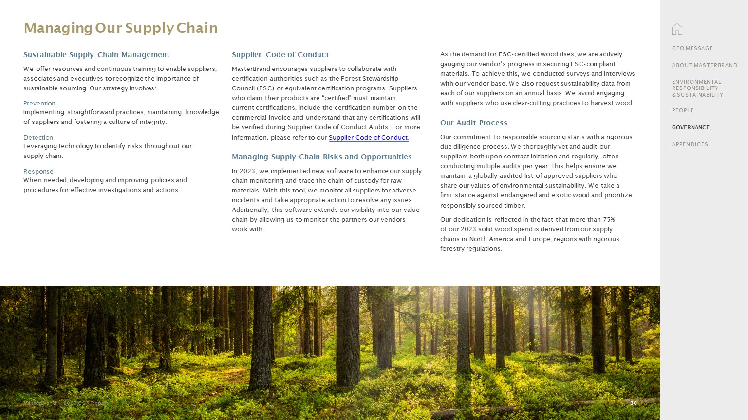 Managing Our Supply Chain  Sustainable Supply Chain Management  We offer resources and continuous training to enable suppliers, associates and executives to recognize the importance of sustainable sourcing. Our strategy involves:  Prevention  Implementing straightforward practices, maintaining knowledge of suppliers and fostering a culture of integrity.  Detection  Leveraging technology to identify risks throughout our supply chain.  Response  When needed, developing and improving policies and procedures for effective investigations and actions.  Supplier Code of Conduct  MasterBrand encourages suppliers to collaborate with certification authorities such as the Forest Stewardship Council (FSC) or equivalent certification programs. Suppliers who claim their products are “certified” must maintain current certifications, include the certification number on the commercial invoice and understand that any certifications will be verified during Supplier Code of Conduct Audits. For more information, please refer to our Supplier Code of Conduct.  Managing Supply Chain Risks and Opportunities  In 2023, we implemented new software to enhance our supply chain monitoring and trace the chain of custody for raw materials. With this tool, we monitor all suppliers for adverse incidents and take appropriate action to resolve any issues.  Additionally, this software extends our visibility into our value chain by allowing us to monitor the partners our vendors work with.  As the demand for FSC-certified wood rises, we are actively gauging our vendor’s progress in securing FSC-compliant materials. To achieve this, we conducted surveys and interviews with our vendor base. We also request sustainability data from each of our suppliers on an annual basis. We avoid engaging with suppliers who use clear-cutting practices to harvest wood.  Our Audit Process  Our commitment to responsible sourcing starts with a rigorous due diligence process. We thoroughly vet and audit our suppliers both upon contract initiation and regularly, often conducting multiple audits per year. This helps ensure we maintain a globally audited list of approved suppliers who share our values of environmental sustainability. We take a firm stance against endangered and exotic wood and prioritize responsibly sourced timber.  Our dedication is reflected in the fact that more than 75% of our 2023 solid wood spend is derived from our supply chains in North America and Europe, regions with rigorous forestry regulations.  CEO MESSAGE  ABOUT MASTERBRAND  PEOPLE  APPENDICES  GOVERNANCE  ENVIRONMENTAL RESPONSIBILITY & SUSTAINABILITY  GOVERNANCE  MasterBrand | 2023 CSR Report  20