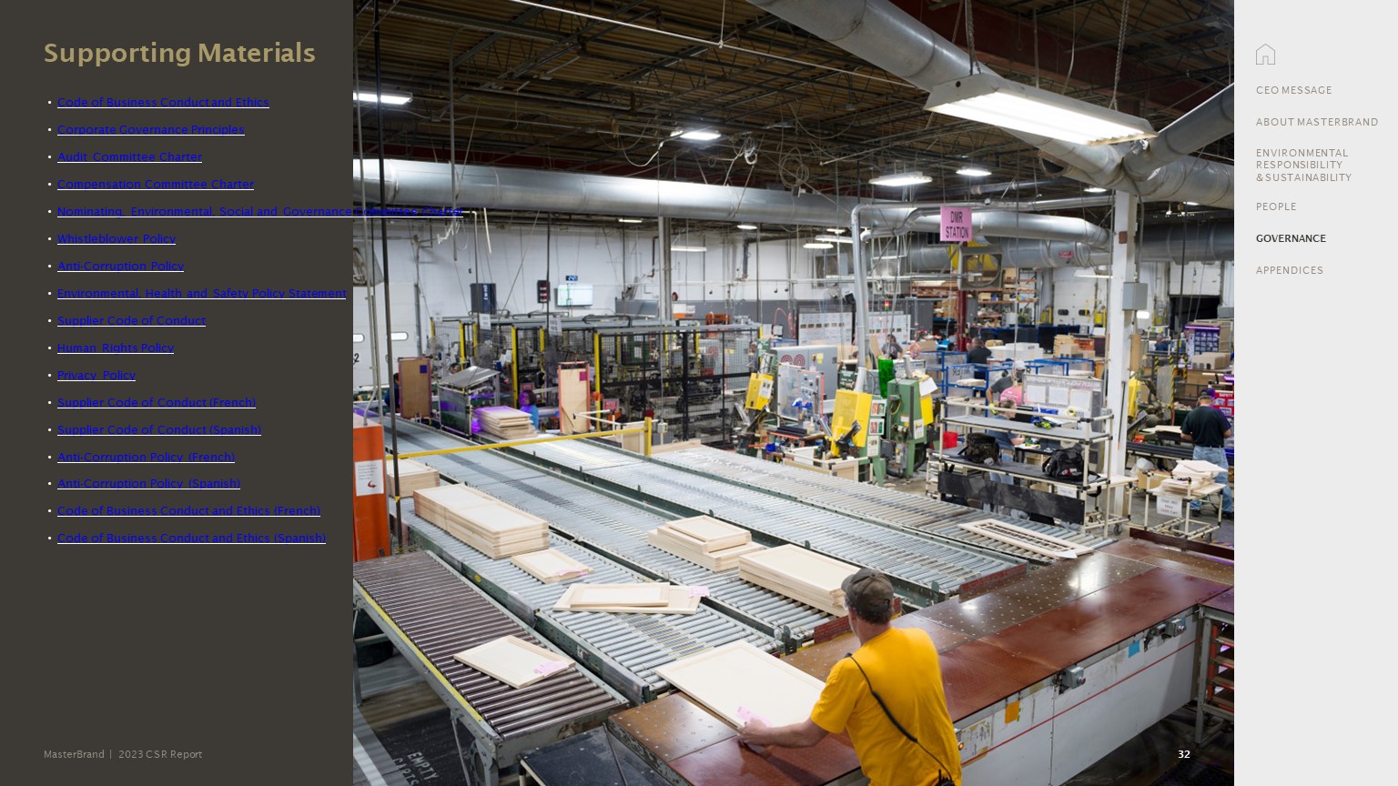 Supporting Materials  Code of Business Conduct and Ethics  Corporate Governance Principles  Audit Committee Charter  Compensation Committee Charter  Nominating, Environmental, Social and Governance Committee Charter  Whistleblower Policy  Anti-Corruption Policy  Environmental, Health and Safety Policy Statement  Supplier Code of Conduct  Human Rights Policy  Privacy Policy  Supplier Code of Conduct (French)  Supplier Code of Conduct (Spanish)  Anti-Corruption Policy (French)  Anti-Corruption Policy (Spanish)  Code of Business Conduct and Ethics (French)  Code of Business Conduct and Ethics (Spanish)  CEO MESSAGE  ABOUT MASTERBRAND  PEOPLE  APPENDICES  GOVERNANCE  ENVIRONMENTAL RESPONSIBILITY & SUSTAINABILITY  GOVERNANCE  MasterBrand | 2023 CSR Report  20