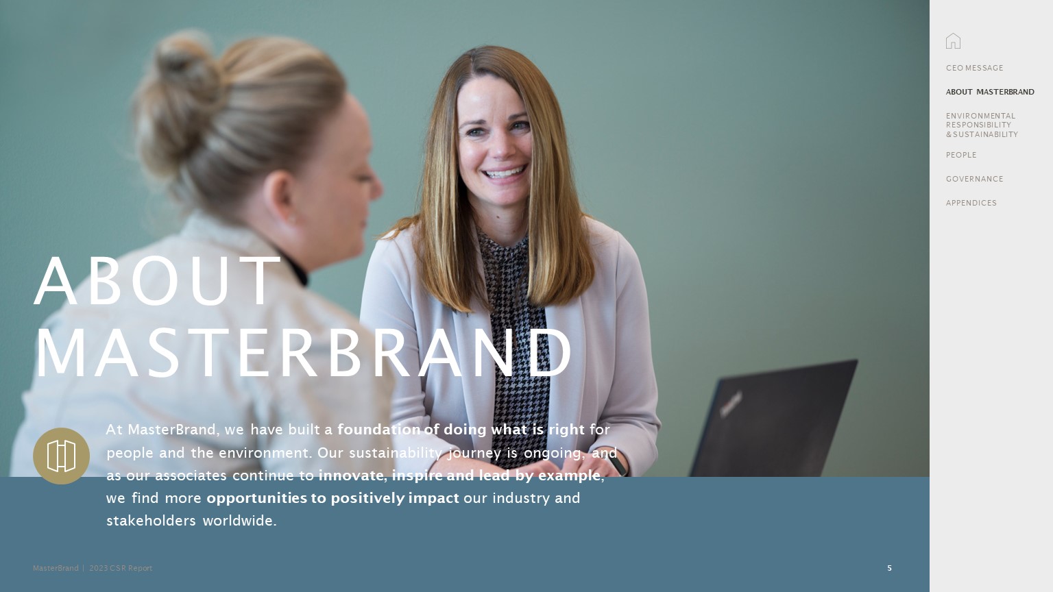 ABOUT  MASTERBRAND  At MasterBrand, we have built a foundation of doing what is right for people and the environment. Our sustainability journey is ongoing, and as our associates continue to innovate, inspire and lead by example, we find more opportunities to positively impact our industry and stakeholders worldwide.  ABOUT MASTERBRAND  CEO MESSAGE  ABOUT MASTERBRAND  ENVIRONMENTAL RESPONSIBILITY & SUSTAINABILITY  PEOPLE GOVERNANCE APPENDICES  MasterBrand | 2023 CSR Report  20