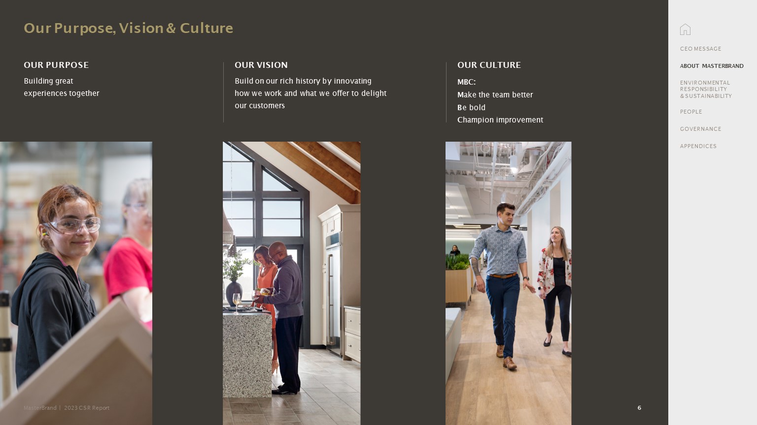 Our Purpose, Vision & Culture  OUR PURPOSE  Building great experiences together  OUR VISION  Build on our rich history by innovating how we work and what we offer to delight our customers  OUR CULTURE  MBC:  Make the team better  Be bold  Champion improvement  CEO MESSAGE  ABOUT MASTERBRAND  PEOPLE  GOVERNANCE  APPENDICES  ENVIRONMENTAL RESPONSIBILITY & SUSTAINABILITY  ABOUT MASTERBRAND  MasterBrand | 2023 CSR Report  20
