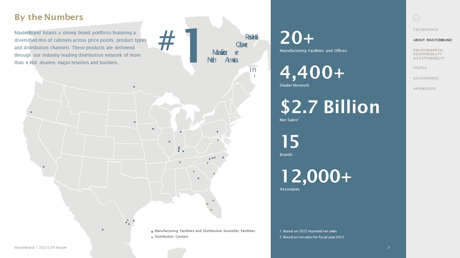 By the Numbers  20+  Manufacturing Facilities and Offices  4,400+  Dealer Network  $2.7 Billion  Net Sales2  15  Brands  12,000+  Associates  MasterBrand boasts a strong brand portfolio featuring a diversified mix of cabinets across price points, product types and distribution channels. These products are delivered through our industry-leading distribution network of more than 4,400 dealers, major retailers and builders.  #  1NorthManufacturAmericaerCabinetResidential in1  Manufacturing Facilities and Distributive Assembly Facilities Distribution Centers  Based on 2022 reported net sales  Based on net sales for fiscal year 2023  CEO MESSAGE  ABOUT MASTERBRAND  PEOPLE  APPENDICES  GOVERNANCE  ENVIRONMENTAL RESPONSIBILITY & SUSTAINABILITY  ABOUT MASTERBRAND  MasterBrand | 2023 CSR Report  20