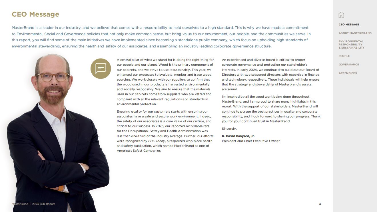 An experienced and diverse board is critical to proper corporate governance and protecting our stakeholder’s interests. In early 2024, we continued to build out our Board of Directors with two seasoned directors with expertise in finance and technology, respectively. These individuals will help ensure that the strategy and stewardship of Masterbrand’s assets  are sound.  I’m inspired by all the good work being done throughout MasterBrand, and I am proud to share many highlights in this report. With the support of our stakeholders, MasterBrand will continue to pursue the best practices in quality and corporate responsibility, and I look forward to sharing our progress. Thank you for your continued trust in MasterBrand.  Sincerely,  R. David Banyard, Jr.  President and Chief Executive Officer  CEO Message  A central pillar of what we stand for is doing the right thing for our people and our planet. Wood is the primary component of our cabinets, and we strive to use it sustainably. This year, we enhanced our processes to evaluate, monitor and trace wood sourcing. We work closely with our suppliers to confirm that the wood used in our products is harvested environmentally and socially responsibly. We aim to ensure that the materials used in our cabinets come from suppliers who are vetted and compliant with all the relevant regulations and standards in environmental protection.  Ensuring quality for our customers starts with ensuring our associates have a safe and secure work environment. Indeed, the safety of our associates is a core value of our culture, and critical to our success. In 2023, our reported recordable rate for the Occupational Safety and Health Administration was less than one-third of the industry average. Further, our efforts were recognized by EHS Today, a respected workplace health and safety publication, which named MasterBrand as one of America’s Safest Companies.  MasterBrand is a leader in our industry, and we believe that comes with a responsibility to hold ourselves to a high standard. This is why we have made a commitment to Environmental, Social and Governance policies that not only make common sense, but bring value to our environment, our people, and the communities we serve. In this report, you will find some of the main initiatives we have implemented since becoming a standalone public company, which focus on upholding high standards of environmental stewardship, ensuring the health and safety of our associates, and assembling an industry leading corporate governance structure.  CEO MESSAGE  ABOUT MASTERBRAND  PEOPLE  APPENDICES  GOVERNANCE  ENVIRONMENTAL RESPONSIBILITY & SUSTAINABILITY  CEO MESSAGE  MasterBrand | 2023 CSR Report  20