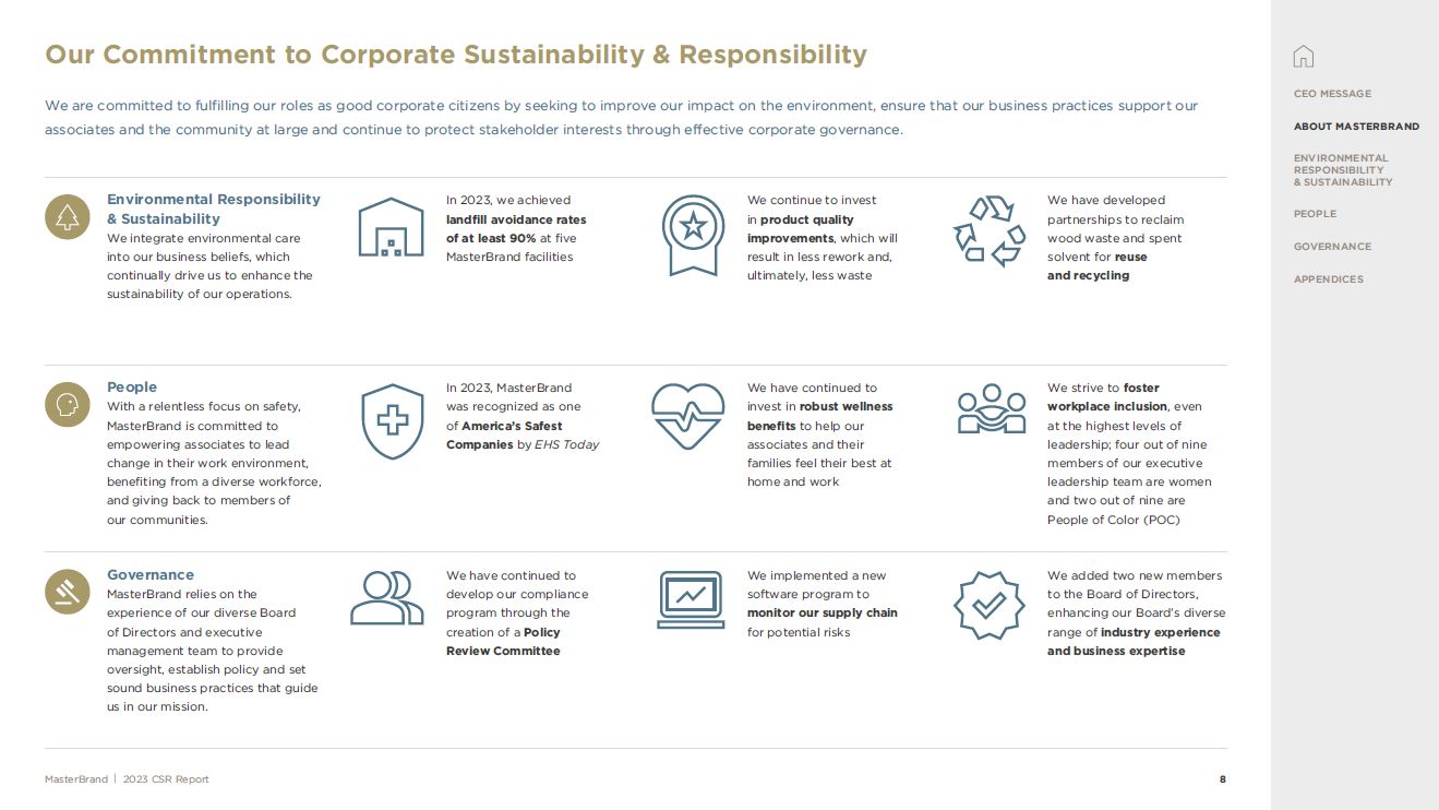 Our Commitment to Corporate Sustainability & Responsibility  People  With a relentless focus on safety, MasterBrand is committed to empowering associates to lead change in their work environment, benefiting from a diverse workforce, and giving back to members of  our communities.  We are committed to fulfilling our roles as good corporate citizens by seeking to improve our impact on the environment, ensure that our business practices support our associates and the community at large and continue to protect stakeholder interests through effective corporate governance.  Environmental Responsibility & Sustainability  We integrate environmental care into our business beliefs, which continually drive us to enhance the sustainability of our operations.  Governance  MasterBrand relies on the experience of our diverse Board of Directors and executive management team to provide oversight, establish policy and set  sound business practices that guide us in our mission.  We have developed partnerships to reclaim wood waste and spent solvent for reuse  and recycling  We strive to foster workplace inclusion, even at the highest levels of leadership; four out of nine members of our executive leadership team are women and two out of nine are People of Color (POC)  We have continued to develop our compliance program through the creation of a Policy Review Committee  In 2023, we achieved landfill avoidance rates of at least 90% at five MasterBrand facilities  We continue to invest in product quality  improvements, which will result in less rework and, ultimately, less waste  In 2023, MasterBrand was recognized as one of America’s Safest  Companies by EHS Today  We have continued to invest in robust wellness benefits to help our associates and their families feel their best at home and work  We implemented a new software program to monitor our supply chain for potential risks  We added two new members to the Board of Directors, enhancing our Board’s diverse range of industry experience and business expertise  CEO MESSAGE  ABOUT MASTERBRAND  PEOPLE  APPENDICES  GOVERNANCE  ENVIRONMENTAL RESPONSIBILITY & SUSTAINABILITY  ABOUT MASTERBRAND  MasterBrand | 2023 CSR Report  20