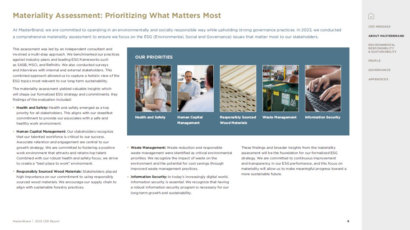 OUR PRIORITIES  Materiality Assessment: Prioritizing What Matters Most  This assessment was led by an independent consultant and involved a multi-step approach. We benchmarked our practices against industry peers and leading ESG frameworks such  as SASB, MSCI, and Refinitiv. We also conducted surveys and interviews with internal and external stakeholders. This  combined approach allowed us to capture a holistic view of the ESG topics most relevant to our long-term sustainability.  The materiality assessment yielded valuable insights which will shape our formalized ESG strategy and commitments. Key findings of the evaluation included:  Health and Safety: Health and safety emerged as a top priority for all stakeholders. This aligns with our steadfast commitment to provide our associates with a safe and healthy work environment.  Human Capital Management: Our stakeholders recognize that our talented workforce is critical to our success. Associate retention and engagement are central to our growth strategy. We are committed to fostering a positive work environment that attracts and retains top talent. Combined with our robust health and safety focus, we strive to create a “best place to work” environment.  Responsibly Sourced Wood Materials: Stakeholders placed high importance on our commitment to using responsibly sourced wood materials. We encourage our supply chain to align with sustainable forestry practices.  At MasterBrand, we are committed to operating in an environmentally and socially responsible way while upholding strong governance practices. In 2023, we conducted a comprehensive materiality assessment to ensure we focus on the ESG (Environmental, Social and Governance) issues that matter most to our stakeholders.  Waste Management: Waste reduction and responsible waste management were identified as critical environmental priorities. We recognize the impact of waste on the environment and the potential for cost savings through improved waste management practices.  Information Security: In today’s increasingly digital world, information security is essential. We recognize that having a robust information security program is necessary for our long-term growth and sustainability.  These findings and broader insights from the materiality assessment will be the foundation for our formalized ESG strategy. We are committed to continuous improvement and transparency in our ESG performance, and this focus on  materiality will allow us to make meaningful progress toward a more sustainable future.  Information Security  Health and Safety  Human Capital Management  Responsibly Sourced Wood Materials  Waste Management  CEO MESSAGE  ABOUT MASTERBRAND  PEOPLE  APPENDICES  GOVERNANCE  ENVIRONMENTAL RESPONSIBILITY & SUSTAINABILITY  ABOUT MASTERBRAND  MasterBrand | 2023 CSR Report  20