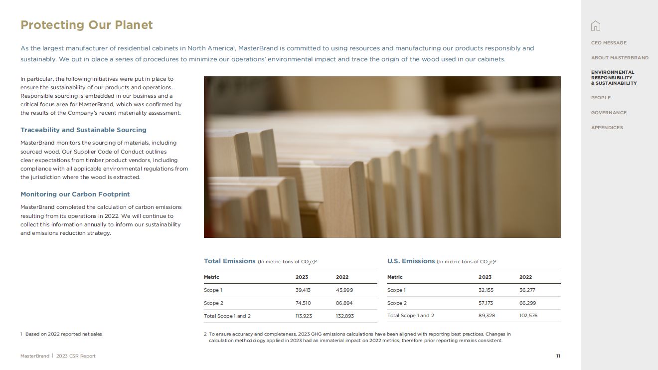Protecting Our Planet  As the largest manufacturer of residential cabinets in North America1, MasterBrand is committed to using resources and manufacturing our products responsibly and sustainably. We put in place a series of procedures to minimize our operations’ environmental impact and trace the origin of the wood used in our cabinets.  1 Based on 2022 reported net sales  Metric  2023  2022  Metric  2023  2022  Scope 1  39,413  45,999  Scope 1  32,155  36,277  Scope 2  74,510  86,894  Scope 2  57,173  66,299  Total Scope 1 and 2  113,923  132,893  Total Scope 1 and 2  89,328  102,576  Total Emissions (In metric tons of CO e)2  2  U.S. Emissions (In metric tons of CO e)2  2  In particular, the following initiatives were put in place to ensure the sustainability of our products and operations. Responsible sourcing is embedded in our business and a critical focus area for MasterBrand, which was confirmed by the results of the Company’s recent materiality assessment.  Traceability and Sustainable Sourcing  MasterBrand monitors the sourcing of materials, including sourced wood. Our Supplier Code of Conduct outlines clear expectations from timber product vendors, including  compliance with all applicable environmental regulations from the jurisdiction where the wood is extracted.  Monitoring our Carbon Footprint  MasterBrand completed the calculation of carbon emissions resulting from its operations in 2022. We will continue to collect this information annually to inform our sustainability and emissions reduction strategy.  2 To ensure accuracy and completeness, 2023 GHG emissions calculations have been aligned with reporting best practices. Changes in calculation methodology applied in 2023 had an immaterial impact on 2022 metrics, therefore prior reporting remains consistent.  CEO MESSAGE  ABOUT MASTERBRAND  PEOPLE  APPENDICES  GOVERNANCE  ENVIRONMENTAL  RESPONSIBILITY & SUSTAINABILITY  ENVIRONMENTAL RESPONSIBILITY & SUSTAINABILITY  MasterBrand | 2023 CSR Report  20