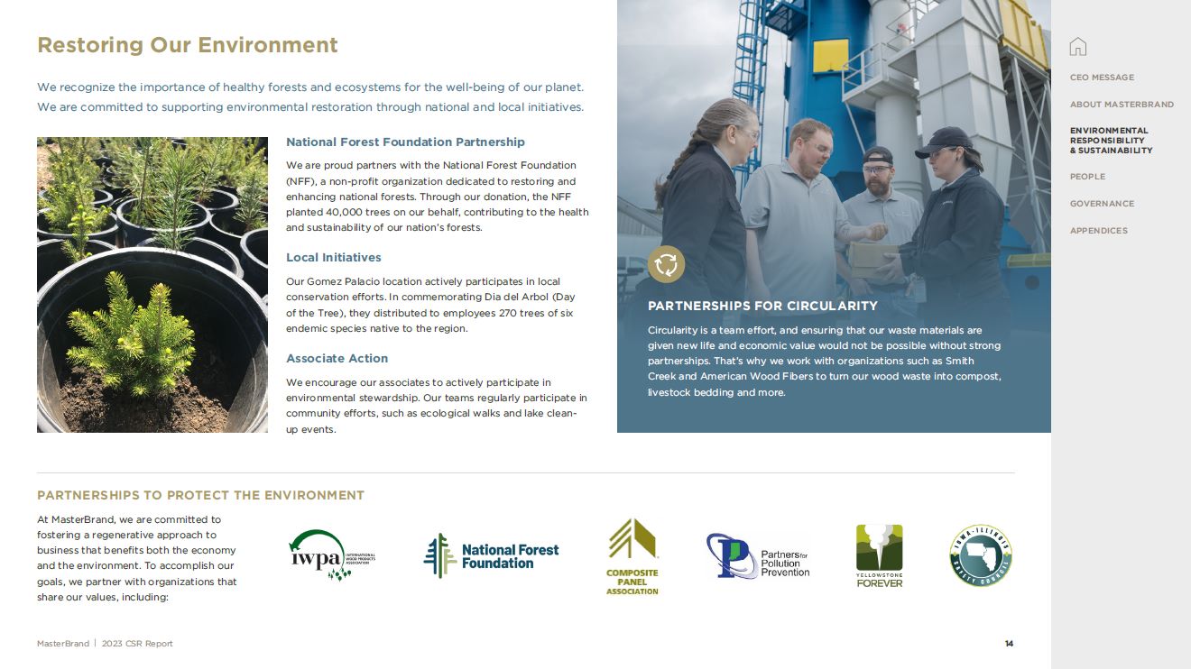 National Forest Foundation Partnership  We are proud partners with the National Forest Foundation (NFF), a non-profit organization dedicated to restoring and enhancing national forests. Through our donation, the NFF planted 40,000 trees on our behalf, contributing to the health and sustainability of our nation’s forests.  Local Initiatives  Our Gomez Palacio location actively participates in local conservation efforts. In commemorating Dia del Arbol (Day of the Tree), they distributed to employees 270 trees of six endemic species native to the region.  Associate Action  We encourage our associates to actively participate in environmental stewardship. Our teams regularly participate in community efforts, such as ecological walks and lake clean- up events.  PARTNERSHIPS TO PROTECT THE ENVIRONMENT  At MasterBrand, we are committed to fostering a regenerative approach to business that benefits both the economy and the environment. To accomplish our goals, we partner with organizations that share our values, including:  Restoring Our Environment  PARTNERSHIPS FOR CIRCULARITY  Circularity is a team effort, and ensuring that our waste materials are given new life and economic value would not be possible without strong partnerships. That’s why we work with organizations such as Smith Creek and American Wood Fibers to turn our wood waste into compost, livestock bedding and more.  We recognize the importance of healthy forests and ecosystems for the well-being of our planet. We are committed to supporting environmental restoration through national and local initiatives.  CEO MESSAGE  ABOUT MASTERBRAND  PEOPLE  APPENDICES  GOVERNANCE  ENVIRONMENTAL  RESPONSIBILITY & SUSTAINABILITY  ENVIRONMENTAL RESPONSIBILITY & SUSTAINABILITY  MasterBrand | 2023 CSR Report  20