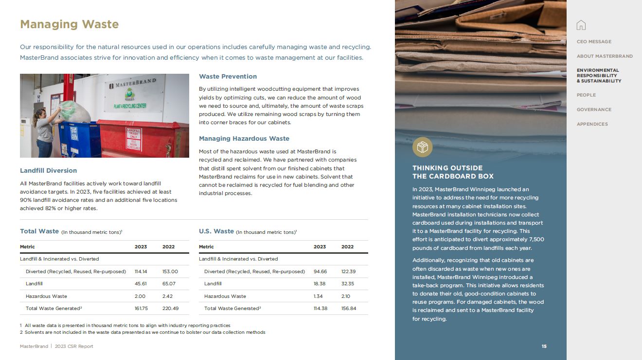 Landfill Diversion  All MasterBrand facilities actively work toward landfill avoidance targets. In 2023, five facilities achieved at least 90% landfill avoidance rates and an additional five locations achieved 82% or higher rates.  Managing Waste  Our responsibility for the natural resources used in our operations includes carefully managing waste and recycling. MasterBrand associates strive for innovation and efficiency when it comes to waste management at our facilities.  THINKING OUTSIDE THE CARDBOARD BOX  In 2023, MasterBrand Winnipeg launched an initiative to address the need for more recycling resources at many cabinet installation sites.  MasterBrand installation technicians now collect cardboard used during installations and transport  often discarded as waste when new ones are installed, MasterBrand Winnipeg introduced a take-back program. This initiative allows residents to donate their old, good-condition cabinets to reuse programs. For damaged cabinets, the wood is reclaimed and sent to a MasterBrand facility  for recycling.  Diverted (Recycled, Reused, Re-purposed)  114.14  153.00  Diverted (Recycled, Reused, Re-purposed)  94.66  122.39  Landfill  45.61  65.07  Landfill  18.38  32.35  Hazardous Waste  2.00  2.42  Hazardous Waste  1.34  2.10  Total Waste Generated2  161.75  220.49  Total Waste Generated2  114.38  156.84  Total Waste (In thousand metric tons)1  Metric  2023  2022  U.S. Waste (In thousand metric tons)1  Metric  2023  2022  it to a MasterBrand facility for recycling. This  effort is anticipated to divert approximately 7,500 pounds of cardboard from landfills each year.  Landfill & Incinerated vs. Diverted  Landfill & Incinerated vs. Diverted  Additionally, recognizing that old cabinets are  Waste Prevention  By utilizing intelligent woodcutting equipment that improves yields by optimizing cuts, we can reduce the amount of wood we need to source and, ultimately, the amount of waste scraps produced. We utilize remaining wood scraps by turning them into corner braces for our cabinets.  Managing Hazardous Waste  Most of the hazardous waste used at MasterBrand is recycled and reclaimed. We have partnered with companies that distill spent solvent from our finished cabinets that MasterBrand reclaims for use in new cabinets. Solvent that cannot be reclaimed is recycled for fuel blending and other industrial processes.  All waste data is presented in thousand metric tons to align with industry reporting practices  Solvents are not included in the waste data presented as we continue to bolster our data collection methods  CEO MESSAGE  ABOUT MASTERBRAND  PEOPLE  APPENDICES  GOVERNANCE  ENVIRONMENTAL  RESPONSIBILITY & SUSTAINABILITY  ENVIRONMENTAL RESPONSIBILITY & SUSTAINABILITY  MasterBrand | 2023 CSR Report  20