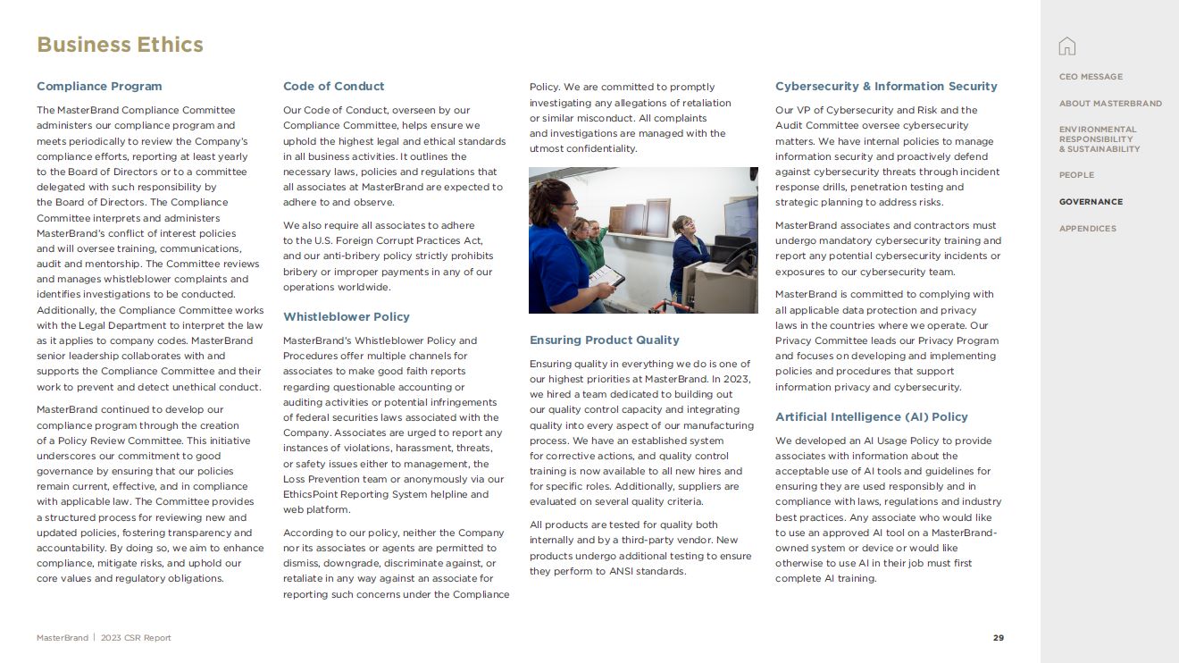 Policy. We are committed to promptly investigating any allegations of retaliation or similar misconduct. All complaints  and investigations are managed with the utmost confidentiality.  Ensuring Product Quality  Ensuring quality in everything we do is one of our highest priorities at MasterBrand. In 2023, we hired a team dedicated to building out our quality control capacity and integrating  quality into every aspect of our manufacturing process. We have an established system  for corrective actions, and quality control training is now available to all new hires and for specific roles. Additionally, suppliers are evaluated on several quality criteria.  All products are tested for quality both internally and by a third-party vendor. New products undergo additional testing to ensure they perform to ANSI standards.  Compliance Program  The MasterBrand Compliance Committee administers our compliance program and meets periodically to review the Company’s compliance efforts, reporting at least yearly to the Board of Directors or to a committee delegated with such responsibility by  the Board of Directors. The Compliance Committee interprets and administers MasterBrand’s conflict of interest policies and will oversee training, communications,  audit and mentorship. The Committee reviews and manages whistleblower complaints and identifies investigations to be conducted.  Additionally, the Compliance Committee works with the Legal Department to interpret the law as it applies to company codes. MasterBrand senior leadership collaborates with and supports the Compliance Committee and their work to prevent and detect unethical conduct.  MasterBrand continued to develop our compliance program through the creation of a Policy Review Committee. This initiative underscores our commitment to good governance by ensuring that our policies remain current, effective, and in compliance  with applicable law. The Committee provides a structured process for reviewing new and updated policies, fostering transparency and  accountability. By doing so, we aim to enhance compliance, mitigate risks, and uphold our core values and regulatory obligations.  Business Ethics  Code of Conduct  Our Code of Conduct, overseen by our Compliance Committee, helps ensure we uphold the highest legal and ethical standards in all business activities. It outlines the necessary laws, policies and regulations that all associates at MasterBrand are expected to adhere to and observe.  We also require all associates to adhere to the U.S. Foreign Corrupt Practices Act,  and our anti-bribery policy strictly prohibits bribery or improper payments in any of our operations worldwide.  Whistleblower Policy  MasterBrand’s Whistleblower Policy and Procedures offer multiple channels for associates to make good faith reports regarding questionable accounting or auditing activities or potential infringements of federal securities laws associated with the Company. Associates are urged to report any instances of violations, harassment, threats, or safety issues either to management, the Loss Prevention team or anonymously via our EthicsPoint Reporting System helpline and web platform.  According to our policy, neither the Company nor its associates or agents are permitted to dismiss, downgrade, discriminate against, or retaliate in any way against an associate for reporting such concerns under the Compliance  Cybersecurity & Information Security  Our VP of Cybersecurity and Risk and the Audit Committee oversee cybersecurity matters. We have internal policies to manage information security and proactively defend against cybersecurity threats through incident response drills, penetration testing and strategic planning to address risks.  MasterBrand associates and contractors must undergo mandatory cybersecurity training and report any potential cybersecurity incidents or exposures to our cybersecurity team.  MasterBrand is committed to complying with all applicable data protection and privacy laws in the countries where we operate. Our Privacy Committee leads our Privacy Program and focuses on developing and implementing policies and procedures that support information privacy and cybersecurity.  Artificial Intelligence (AI) Policy  We developed an AI Usage Policy to provide associates with information about the acceptable use of AI tools and guidelines for ensuring they are used responsibly and in compliance with laws, regulations and industry best practices. Any associate who would like to use an approved AI tool on a MasterBrand- owned system or device or would like otherwise to use AI in their job must first complete AI training.  CEO MESSAGE  ABOUT MASTERBRAND  PEOPLE  APPENDICES  GOVERNANCE  ENVIRONMENTAL RESPONSIBILITY & SUSTAINABILITY  GOVERNANCE  MasterBrand | 2023 CSR Report  20