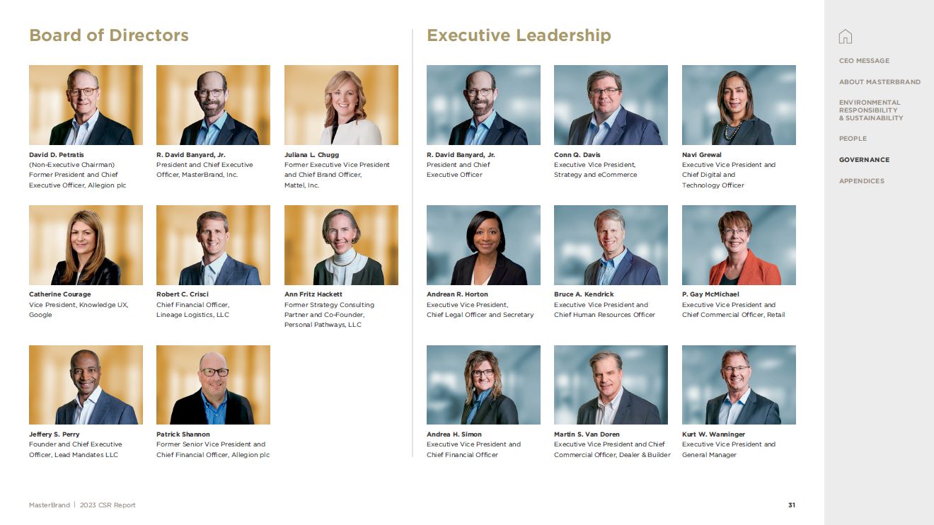 R. David Banyard, Jr. President and Chief Executive Officer  R. David Banyard, Jr. President and Chief Executive Officer, MasterBrand, Inc.  Andrean R. Horton  Executive Vice President,  Chief Legal Officer and Secretary  Ann Fritz Hackett  Former Strategy Consulting Partner and Co-Founder, Personal Pathways, LLC  Bruce A. Kendrick  Executive Vice President and Chief Human Resources Officer  Jeffery S. Perry  Founder and Chief Executive Officer, Lead Mandates LLC  Patrick Shannon  Former Senior Vice President and Chief Financial Officer, Allegion plc  P. Gay McMichael  Executive Vice President and Chief Commercial Officer, Retail  David D. Petratis  (Non-Executive Chairman) Former President and Chief Executive Officer, Allegion plc  Catherine Courage  Vice President, Knowledge UX, Google  Andrea H. Simon  Executive Vice President and Chief Financial Officer  Martin S. Van Doren  Executive Vice President and Chief Commercial Officer, Dealer & Builder  Kurt W. Wanninger Executive Vice President and General Manager  Conn Q. Davis  Executive Vice President, Strategy and eCommerce  Juliana L. Chugg  Former Executive Vice President and Chief Brand Officer,  Mattel, Inc.  Navi Grewal  Executive Vice President and Chief Digital and  Technology Officer  Robert C. Crisci  Chief Financial Officer, Lineage Logistics, LLC  Board of Directors  Executive Leadership  APPENDICES  GOVERNANCE  CEO MESSAGE  ABOUT MASTERBRAND  ENVIRONMENTAL RESPONSIBILITY & SUSTAINABILITY  PEOPLE  GOVERNANCE  MasterBrand | 2023 CSR Report  20