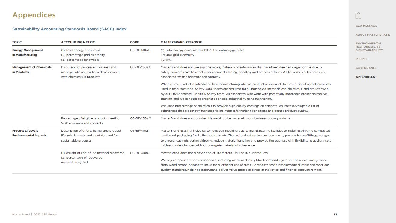 Appendices  Sustainability Accounting Standards Board (SASB) Index  TOPIC  ACCOUNTING METRIC  CODE  MASTERBRAND RESPONSE  Energy Management in Manufacturing  Total energy consumed,  percentage grid electricity,  percentage renewable  CG-BF-130a.1  Total energy consumed in 2023: 1.52 million gigajoules.  48% grid electricity.  11%.  Management of Chemicals in Products  Discussion of processes to assess and manage risks and/or hazards associated with chemicals in products  CG-BF-250a.1  MasterBrand does not use any chemicals, materials or substances that have been deemed illegal for use due to safety concerns. We have set clear chemical labeling, handling and process policies. All hazardous substances and associated wastes are managed properly.  When a new product is introduced to a manufacturing site, we conduct a review of the new product and all materials used in manufacturing. Safety Data Sheets are required for all purchased materials and chemicals, and are reviewed by our Environmental, Health & Safety team. All associates who work with potentially hazardous chemicals receive training, and we conduct appropriate periodic industrial hygiene monitoring.  We use a broad range of chemicals to provide high-quality coatings on cabinets. We have developed a list of substances that are strictly managed to maintain safe working conditions and ensure product quality.  Percentage of eligible products meeting VOC emissions and contents  CG-BF-250a.2  MasterBrand does not consider this metric to be material to our business or our products.  Product Lifecycle Environmental Impacts  Description of efforts to manage product lifecycle impacts and meet demand for sustainable products  CG-BF-410a.1  MasterBrand uses right-size carton creation machinery at its manufacturing facilities to make just-in-time corrugated cardboard packaging for its finished cabinets. The customized cartons reduce waste, provide better-fitting packages to protect cabinets during shipping, reduce material handling and provide the business with flexibility to add or make cabinet model changes without corrugate material obsolescence.  Weight of end-of-life material recovered,  percentage of recovered materials recycled  CG-BF-410a.2  MasterBrand does not recover end-of-life material for use in our products.  We buy composite wood components, including medium density fiberboard and plywood. These are usually made from wood scraps, helping to make more efficient use of trees. Composite wood products are durable and meet our quality standards, helping MasterBrand deliver value-priced cabinets in the styles and finishes consumers want.  CEO MESSAGE  ABOUT MASTERBRAND  PEOPLE  APPENDICES  GOVERNANCE  ENVIRONMENTAL RESPONSIBILITY & SUSTAINABILITY  APPENDICES  MasterBrand | 2023 CSR Report  20