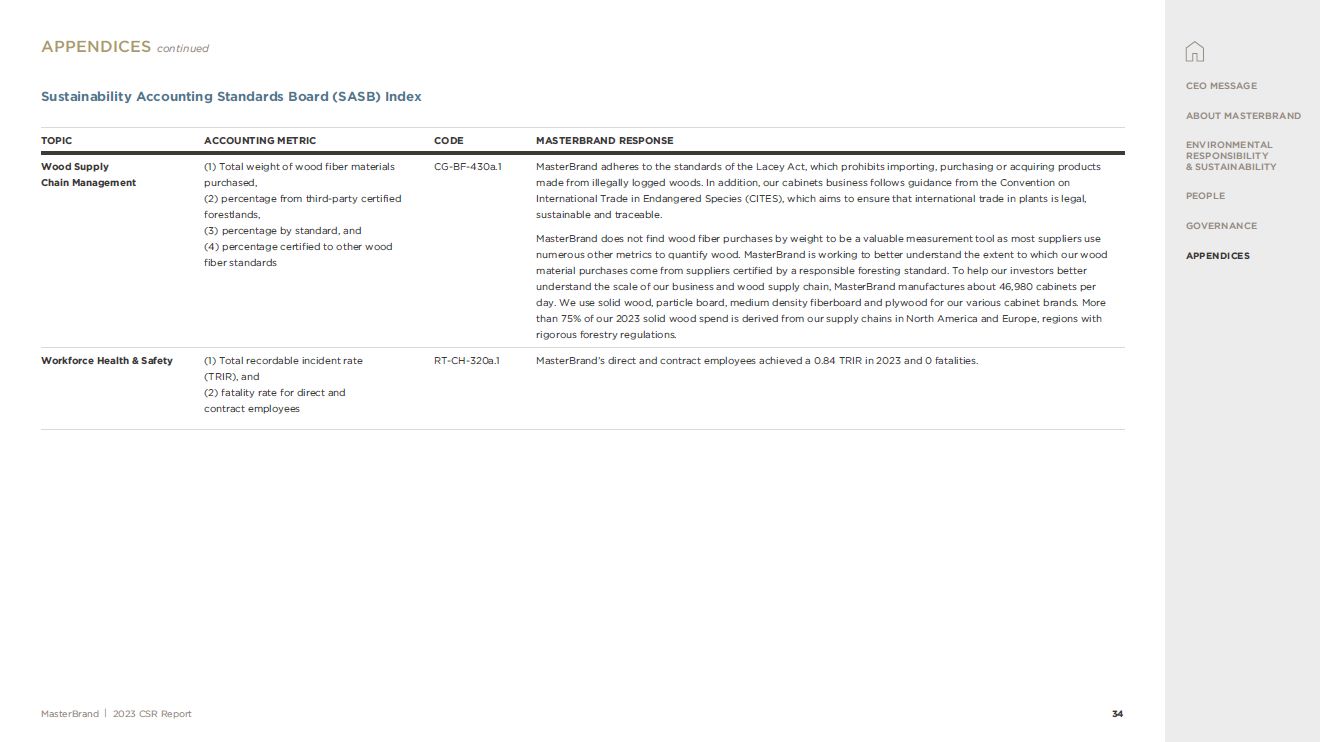 TOPIC  ACCOUNTING METRIC  CODE  MASTERBRAND RESPONSE  Wood Supply Chain Management  Total weight of wood fiber materials purchased,  percentage from third-party certified forestlands,  percentage by standard, and  percentage certified to other wood fiber standards  CG-BF-430a.1  MasterBrand adheres to the standards of the Lacey Act, which prohibits importing, purchasing or acquiring products made from illegally logged woods. In addition, our cabinets business follows guidance from the Convention on International Trade in Endangered Species (CITES), which aims to ensure that international trade in plants is legal, sustainable and traceable.  MasterBrand does not find wood fiber purchases by weight to be a valuable measurement tool as most suppliers use numerous other metrics to quantify wood. MasterBrand is working to better understand the extent to which our wood material purchases come from suppliers certified by a responsible foresting standard. To help our investors better understand the scale of our business and wood supply chain, MasterBrand manufactures about 46,980 cabinets per day. We use solid wood, particle board, medium density fiberboard and plywood for our various cabinet brands. More than 75% of our 2023 solid wood spend is derived from our supply chains in North America and Europe, regions with rigorous forestry regulations.  Workforce Health & Safety  Total recordable incident rate (TRIR), and  fatality rate for direct and contract employees  RT-CH-320a.1  MasterBrand’s direct and contract employees achieved a 0.84 TRIR in 2023 and 0 fatalities.  APPENDICES continued  Sustainability Accounting Standards Board (SASB) Index  CEO MESSAGE  ABOUT MASTERBRAND  PEOPLE  APPENDICES  GOVERNANCE  ENVIRONMENTAL RESPONSIBILITY & SUSTAINABILITY  APPENDICES  MasterBrand | 2023 CSR Report  20