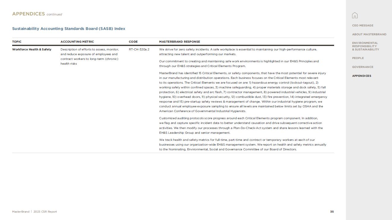 TOPIC  ACCOUNTING METRIC  CODE  MASTERBRAND RESPONSE  Workforce Health & Safety  Description of efforts to assess, monitor, and reduce exposure of employees and contract workers to long-term (chronic) health risks  RT-CH-320a.2  We strive for zero safety incidents. A safe workplace is essential to maintaining our high-performance culture, attracting new talent and outperforming our markets.  Our commitment to creating and maintaining safe work environments is highlighted in our EH&S Principles and through our EH&S strategies and Critical Elements Program.  MasterBrand has identified 15 Critical Elements, or safety components, that have the most potential for severe injury in our manufacturing and distribution operations. Each business focuses on the Critical Elements most relevant  to its operations. The Critical Elements we are focused on are: 1) hazardous energy control (lockout-tagout), 2) working safely within confined spaces, 3) machine safeguarding, 4) proper materials storage and dock safety, 5) fall protection, 6) electrical safety and arc flash, 7) contractor management, 8) powered industrial vehicles, 9) industrial hygiene, 10) overhead doors, 11) physical security, 12) combustible dust, 13) fire prevention, 14) integrated emergency response and 15) pre-startup safety reviews & management of change. Within our industrial hygiene program, we conduct annual employee exposure sampling to ensure all levels are maintained below limits set by OSHA and the American Conference of Governmental Industrial Hygienists.  Customized auditing protocols score progress around each Critical Elements program component. In addition, we flag and capture specific incident data to better understand causation and drive subsequent corrective action activities. We then modify our processes through a Plan-Do-Check-Act system and share lessons learned with the EH&S Leadership Group and senior management.  We track health and safety metrics for full-time, part-time and contract or temporary workers at each of our businesses using our organization-wide EH&S management system. We report on health and safety metrics annually to the Nominating, Environmental, Social and Governance Committee of our Board of Directors.  APPENDICES continued  Sustainability Accounting Standards Board (SASB) Index  CEO MESSAGE  ABOUT MASTERBRAND  PEOPLE  APPENDICES  GOVERNANCE  ENVIRONMENTAL RESPONSIBILITY & SUSTAINABILITY  APPENDICES  MasterBrand | 2023 CSR Report  20