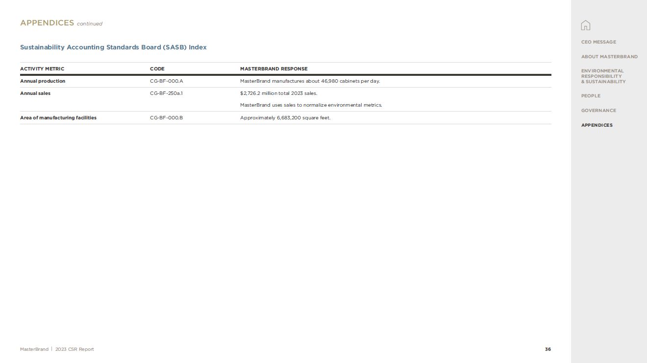 APPENDICES continued  ACTIVITY METRIC  CODE  MASTERBRAND RESPONSE  Annual production  CG-BF-000.A  MasterBrand manufactures about 46,980 cabinets per day.  Annual sales  CG-BF-250a.1  $2,726.2 million total 2023 sales.  MasterBrand uses sales to normalize environmental metrics.  Area of manufacturing facilities  CG-BF-000.B  Approximately 6,683,200 square feet.  Sustainability Accounting Standards Board (SASB) Index  CEO MESSAGE  APPENDICES  ABOUT MASTERBRAND  ENVIRONMENTAL RESPONSIBILITY & SUSTAINABILITY  PEOPLE GOVERNANCE APPENDICES  MasterBrand | 2023 CSR Report  20
