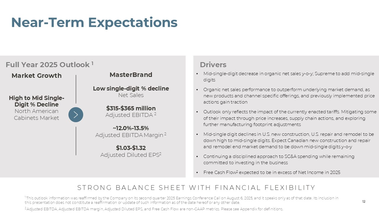 Near-Term Expectations  Full Year 2025 Outlook 1  Mid-single-digit decrease in organic net sales y-o-y; Supreme to add mid-single digits  Organic net sales performance to outperform underlying market demand, as new products and channel specific offerings, and previously implemented price actions gain traction  Outlook only reflects the impact of the currently enacted tariffs. Mitigating some of their impact through price increases, supply chain actions, and exploring further manufacturing footprint adjustments  Mid-single digit declines in U.S. new construction, U.S. repair and remodel to be down high to mid-single digits. Expect Canadian new construction and repair and remodel end market demand to be down mid-single digits y-o-y  Continuing a disciplined approach to SG&A spending while remaining committed to investing in the business   Free Cash Flow2 expected to be in excess of Net Income in 2025  Drivers  Market Growth  High to Mid Single-Digit % Decline  North American Cabinets Market  MasterBrand  Low single-digit % decline  Net Sales  $315-$365 million  Adjusted EBITDA 2  ~12.0%-13.5%  Adjusted EBITDA Margin 2  $1.03-$1.32  Adjusted Diluted EPS2  STRONG BALANCE SHEET WITH FINANCIAL FLEXIBILITY  12  1 This outlook information was reaffirmed by the Company on its second quarter 2025 Earnings Conference Call on August 6, 2025, and it speaks only as of that date. Its inclusion in this presentation does not constitute a reaffirmation or update of such information as of the date hereof or any other date.  2 Adjusted EBITDA, Adjusted EBITDA margin, Adjusted Diluted EPS, and Free Cash Flow are non-GAAP metrics. Please see Appendix for definitions.