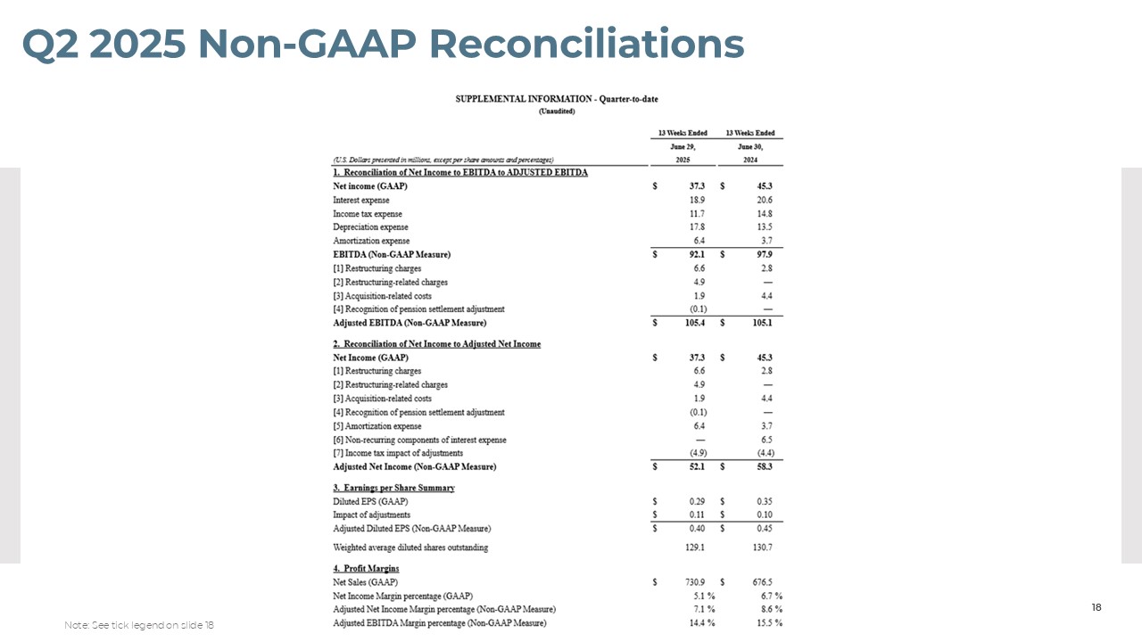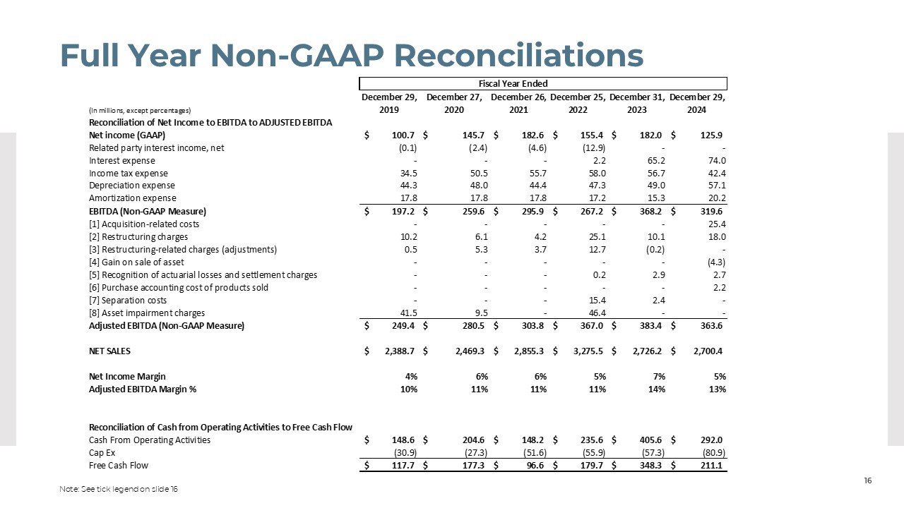 Non-GAAP Financial Measures  To supplement the financial information presented in accordance with generally accepted accounting principles in the United States (“GAAP”) in this presentation, certain non-GAAP financial measures as defined under SEC rules have been included. It is our intent to provide non-GAAP financial information to enhance understanding of our financial information as prepared in accordance with GAAP. Non-GAAP financial measures should be considered in addition to, not as a substitute for, other financial measures prepared in accordance with GAAP. Our methods of determining these non-GAAP financial measures may differ from the methods used by other companies for these or similar non-GAAP financial measures. Accordingly, these non-GAAP financial measures may not be comparable to measures used by other companies.  We use EBITDA, adjusted EBITDA, adjusted EBITDA margin, adjusted net income, adjusted net income margin, adjusted diluted earnings per share (“adjusted diluted EPS”), free cash flow, net debt, and net debt to adjusted EBITDA, which are all non-GAAP financial measures. EBITDA is defined as earnings before interest, taxes, depreciation and amortization. We evaluate the performance of our business based on income before income taxes, but also look to EBITDA as a performance evaluation measure because interest expense is related to corporate functions, as opposed to operations. For that reason, we believe EBITDA is a useful metric to investors in evaluating our operating results. Adjusted EBITDA is calculated by removing the impact of non-operational results and special items from EBITDA. Adjusted EBITDA margin is calculated as adjusted EBITDA divided by net sales. Adjusted net income is calculated by removing the impact of non-operational results, including non-cash amortization expense, which is not deemed to be indicative of the results of current or future operations, and special items from net income. Adjusted net income margin is calculated as adjusted net income divided by net sales. Adjusted diluted EPS is a measure of our diluted earnings per share excluding non-operational results and special items. We believe these non-GAAP measures are useful to investors as they are representative of our core operations and are used in the management of our business, including decisions concerning the allocation of resources and assessment of performance.  Free cash flow is defined as cash flow from operations less capital expenditures. We believe that free cash flow is a useful measure to investors because it is a meaningful indicator of cash generated from operating activities available for the execution of our business strategy, and is used in the management of our business, including decisions concerning the allocation of resources and assessment of performance. Net debt is defined as total balance sheet debt less cash and cash equivalents. We believe this measure is useful to investors as it provides a measure to compare debt less cash and cash equivalents across periods on a consistent basis. Net debt to adjusted EBITDA is calculated by dividing net debt by the trailing twelve months adjusted EBITDA. Net debt to adjusted EBITDA is used by management to assess our financial leverage and ability to service our debt obligations.   As required by SEC rules, detailed reconciliations of these non-GAAP financial measures to the most directly comparable GAAP measure are included in the appendix of this presentation. We have not provided a reconciliation of our fiscal 2025 adjusted EBITDA, adjusted EBITDA margin and adjusted diluted EPS guidance because the information needed to reconcile these measures is unavailable due to the inherent difficulty of forecasting the timing or amount of various items that have not yet occurred, including gains and losses associated with our defined benefit plans and restructuring and other charges, which are excluded from adjusted EBITDA, adjusted EBITDA margin, adjusted net income, adjusted net income margin, and adjusted diluted EPS. Additionally, estimating such GAAP measures and providing a meaningful reconciliation consistent with the Company’s accounting policies for future periods requires a level of precision that is unavailable for these future periods and cannot be accomplished without unreasonable effort. Forward-looking non-GAAP measures are estimated consistent with the relevant definitions and assumptions used for historical non-GAAP measures.  15