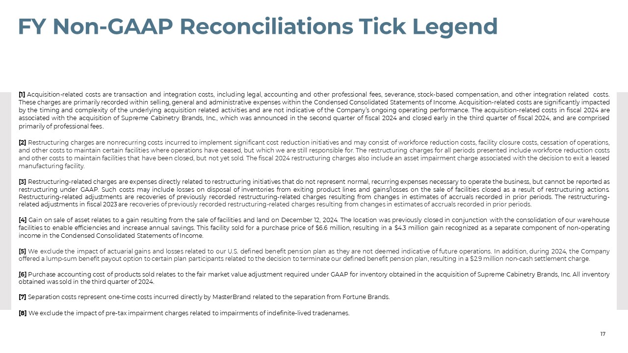 FY Non-GAAP Reconciliations Tick Legend  17  [1] Acquisition-related costs are transaction and integration costs, including legal, accounting and other professional fees, severance, stock-based compensation, and other integration related costs. These charges are primarily recorded within selling, general and administrative expenses within the Condensed Consolidated Statements of Income. Acquisition-related costs are significantly impacted by the timing and complexity of the underlying acquisition related activities and are not indicative of the Company’s ongoing operating performance. The acquisition-related costs in fiscal 2024 are associated with the acquisition of Supreme Cabinetry Brands, Inc., which was announced in the second quarter of fiscal 2024 and closed early in the third quarter of fiscal 2024, and are comprised primarily of professional fees.      [2] Restructuring charges are nonrecurring costs incurred to implement significant cost reduction initiatives and may consist of workforce reduction costs, facility closure costs, cessation of operations, and other costs to maintain certain facilities where operations have ceased, but which we are still responsible for. The restructuring charges for all periods presented include workforce reduction costs and other costs to maintain facilities that have been closed, but not yet sold. The fiscal 2024 restructuring charges also include an asset impairment charge associated with the decision to exit a leased manufacturing facility.     [3] Restructuring-related charges are expenses directly related to restructuring initiatives that do not represent normal, recurring expenses necessary to operate the business, but cannot be reported as restructuring under GAAP. Such costs may include losses on disposal of inventories from exiting product lines and gains/losses on the sale of facilities closed as a result of restructuring actions. Restructuring-related adjustments are recoveries of previously recorded restructuring-related charges resulting from changes in estimates of accruals recorded in prior periods. The restructuring-related adjustments in fiscal 2023 are recoveries of previously recorded restructuring-related charges resulting from changes in estimates of accruals recorded in prior periods.      [4] Gain on sale of asset relates to a gain resulting from the sale of facilities and land on December 12, 2024. The location was previously closed in conjunction with the consolidation of our warehouse facilities to enable efficiencies and increase annual savings. This facility sold for a purchase price of $6.6 million, resulting in a $4.3 million gain recognized as a separate component of non-operating income in the Condensed Consolidated Statements of Income.     [5] We exclude the impact of actuarial gains and losses related to our U.S. defined benefit pension plan as they are not deemed indicative of future operations. In addition, during 2024, the Company offered a lump-sum benefit payout option to certain plan participants related to the decision to terminate our defined benefit pension plan, resulting in a $2.9 million non-cash settlement charge.     [6] Purchase accounting cost of products sold relates to the fair market value adjustment required under GAAP for inventory obtained in the acquisition of Supreme Cabinetry Brands, Inc. All inventory obtained was sold in the third quarter of 2024.     [7] Separation costs represent one-time costs incurred directly by MasterBrand related to the separation from Fortune Brands.     [8] We exclude the impact of pre-tax impairment charges related to impairments of indefinite-lived tradenames.