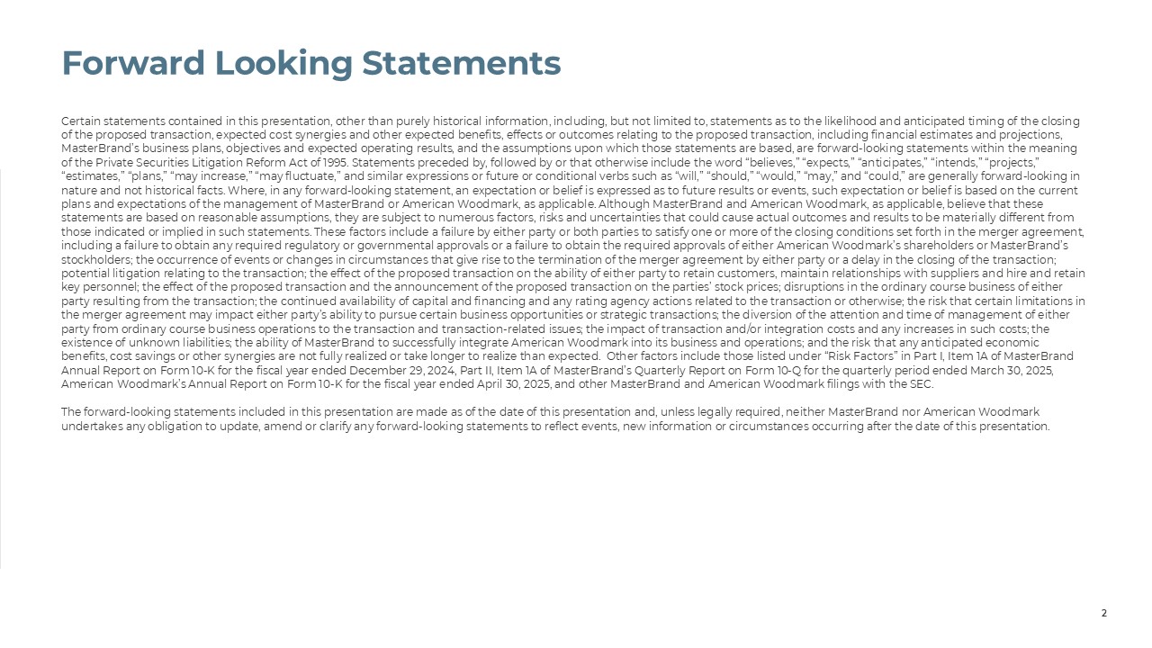 Additional Information and Where to Find It  MasterBrand intends to file with the U.S. Securities and Exchange Commission (“SEC”) a registration statement on Form S-4 (the “Registration Statement”), which will include a joint proxy statement of MasterBrand and American Woodmark that will also constitute a prospectus of MasterBrand. Each of MasterBrand and American Woodmark may also file other relevant documents with the SEC regarding the transaction. This presentation is not a substitute for the joint proxy statement/prospectus or Registration Statement or any other document that MasterBrand or American Woodmark may file with the SEC.  Any definitive joint proxy statement/prospectus (if and when available) will be mailed to shareholders of MasterBrand and American Woodmark. INVESTORS AND SHAREHOLDERS OF MASTERBRAND AND AMERICAN WOODMARK ARE URGED TO READ THE REGISTRATION STATEMENT, JOINT PROXY STATEMENT/PROSPECTUS AND ANY OTHER DOCUMENTS FILED OR TO BE FILED WITH THE SEC IN CONNECTION WITH THE TRANSACTION, AS WELL AS ANY AMENDMENTS OR SUPPLEMENTS TO THESE DOCUMENTS, CAREFULLY AND IN THEIR ENTIRETY IF AND WHEN THEY BECOME AVAILABLE, AS THEY CONTAIN OR WILL CONTAIN IMPORTANT INFORMATION ABOUT MASTERBRAND, AMERICAN WOODMARK, THE TRANSACTION AND RELATED MATTERS. The Registration Statement and joint proxy statement/prospectus and other documents filed by MasterBrand or American Woodmark with the SEC, when filed, will be available free of charge at the SEC’s website at www.sec.gov. Alternatively, investors and shareholders may obtain free copies of documents that are filed or will be filed with the SEC by MasterBrand, including the Registration Statement and the joint proxy statement/prospectus, on Masterbrand’s website at https://masterbrand.com/investors/financials/sec-filings/default.aspx, and may obtain free copies of documents that are filed or will be filed with the SEC by American Woodmark, including the joint proxy statement/prospectus, on American Woodmark’s website at https://americanwoodmark.com/investors/financial-reporting#secfilings. The information included on, or accessible through, MasterBrand’s or American Woodmark’s website is not incorporated by reference into this presentation.     No Offer or Solicitation     This presentation is not intended to be and shall not constitute an offer to sell or the solicitation of an offer to buy any securities or a solicitation of any vote or approval, nor shall there be any sale of securities in any jurisdiction in which such offer, solicitation or sale would be unlawful prior to appropriate registration or qualification under the securities laws of such jurisdiction. No offer of securities shall be made except by means of a prospectus meeting the requirements of Section 10 of the Securities Act of 1933, as amended.     Participants in the Solicitation     MasterBrand, American Woodmark and certain of their respective directors and executive officers may be deemed to be participants in the solicitation of proxies in respect of the transaction. Information about the directors and executive officers of MasterBrand is set forth in MasterBrand’s proxy statement for its 2025 annual meeting of shareholders, which was filed with the SEC on April 24, 2025, including under the headings “Proposal No. 1 Election of Directors—Our Director Nominees,” “Non-Employee Director Compensation,” “Executive Officers,” “Compensation Discussion and Analysis,” “Stock Ownership Information” and “Equity Compensation Plan Information.” Additional information regarding ownership of MasterBrand securities by its directors and executive officers is included in each person’s beneficial ownership reports on Forms 3, 4 and 5, as filed with the SEC. Information about the directors and executive officers of American Woodmark is set forth in its proxy statement for its 2025 annual meeting of shareholders, which was filed with the SEC on June 25, 2025, including under the headings “Item 1 – Election of Directors—Information Regarding Nominees,” “Executive Compensation,” “Non-Management Directors’ Compensation,” and “Security Ownership,” and in its Annual Report on Form 10-K for the fiscal year ended April 30, 2025, which was filed with the SEC on June 25, 2025, including under the heading “Executive Officers of the Registrant.” Additional information regarding ownership of American Woodmark securities by its directors and executive officers is included in each person’s beneficial ownership reports on Forms 3, 4 and 5, as filed with the SEC. Other information regarding the participants in the proxy solicitations and a description of their direct and indirect interests, by security holdings or otherwise, will be contained in the definitive joint proxy statement/prospectus included in the Registration Statement, and other relevant materials to be filed with the SEC regarding the transaction when such materials become available. Investors should read the Registration Statement and the joint proxy statement/prospectus carefully if and when these become available before making any voting or investment decisions. You may obtain free copies of these documents from MasterBrand or American Woodmark using the sources indicated above.  3