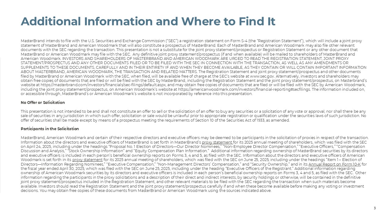 Forward Looking Statements  Certain statements contained in this presentation, other than purely historical information, including, but not limited to, statements as to the likelihood and anticipated timing of the closing of the proposed transaction, expected cost synergies and other expected benefits, effects or outcomes relating to the proposed transaction, including financial estimates and projections, MasterBrand’s business plans, objectives and expected operating results, and the assumptions upon which those statements are based, are forward-looking statements within the meaning of the Private Securities Litigation Reform Act of 1995. Statements preceded by, followed by or that otherwise include the word “believes,” “expects,” “anticipates,” “intends,” “projects,” “estimates,” “plans,” “may increase,” “may fluctuate,” and similar expressions or future or conditional verbs such as “will,” “should,” “would,” “may,” and “could,” are generally forward-looking in nature and not historical facts. Where, in any forward-looking statement, an expectation or belief is expressed as to future results or events, such expectation or belief is based on the current plans and expectations of the management of MasterBrand or American Woodmark, as applicable. Although MasterBrand and American Woodmark, as applicable, believe that these statements are based on reasonable assumptions, they are subject to numerous factors, risks and uncertainties that could cause actual outcomes and results to be materially different from those indicated or implied in such statements. These factors include a failure by either party or both parties to satisfy one or more of the closing conditions set forth in the merger agreement, including a failure to obtain any required regulatory or governmental approvals or a failure to obtain the required approvals of either American Woodmark’s shareholders or MasterBrand’s stockholders; the occurrence of events or changes in circumstances that give rise to the termination of the merger agreement by either party or a delay in the closing of the transaction; potential litigation relating to the transaction; the effect of the proposed transaction on the ability of either party to retain customers, maintain relationships with suppliers and hire and retain key personnel; the effect of the proposed transaction and the announcement of the proposed transaction on the parties’ stock prices; disruptions in the ordinary course business of either party resulting from the transaction; the continued availability of capital and financing and any rating agency actions related to the transaction or otherwise; the risk that certain limitations in the merger agreement may impact either party’s ability to pursue certain business opportunities or strategic transactions; the diversion of the attention and time of management of either party from ordinary course business operations to the transaction and transaction-related issues; the impact of transaction and/or integration costs and any increases in such costs; the existence of unknown liabilities; the ability of MasterBrand to successfully integrate American Woodmark into its business and operations; and the risk that any anticipated economic benefits, cost savings or other synergies are not fully realized or take longer to realize than expected. Other factors include those listed under “Risk Factors” in Part I, Item 1A of MasterBrand Annual Report on Form 10-K for the fiscal year ended December 29, 2024, Part II, Item 1A of MasterBrand’s Quarterly Report on Form 10-Q for the quarterly period ended March 30, 2025, American Woodmark’s Annual Report on Form 10-K for the fiscal year ended April 30, 2025, and other MasterBrand and American Woodmark filings with the SEC.      The forward-looking statements included in this presentation are made as of the date of this presentation and, unless legally required, neither MasterBrand nor American Woodmark undertakes any obligation to update, amend or clarify any forward-looking statements to reflect events, new information or circumstances occurring after the date of this presentation.  2