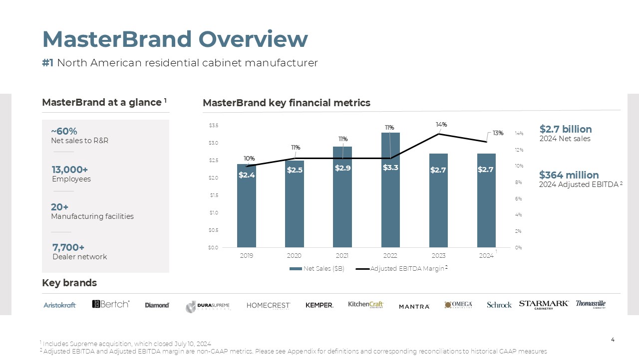 MasterBrand Overview  #1 North American residential cabinet manufacturer   Key brands  1 Includes Supreme acquisition, which closed July 10, 2024  2 Adjusted EBITDA and Adjusted EBITDA margin are non-GAAP metrics. Please see Appendix for definitions and corresponding reconciliations to historical GAAP measures  MasterBrand at a glance 1  ~60%Net sales to R&R  7,700+Dealer network  $364 million  2024 Adjusted EBITDA 2  13,000+Employees  20+Manufacturing facilities  MasterBrand key financial metrics  4   1  $2.7 billion  2024 Net sales  2