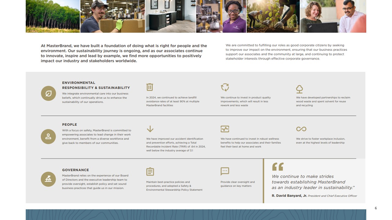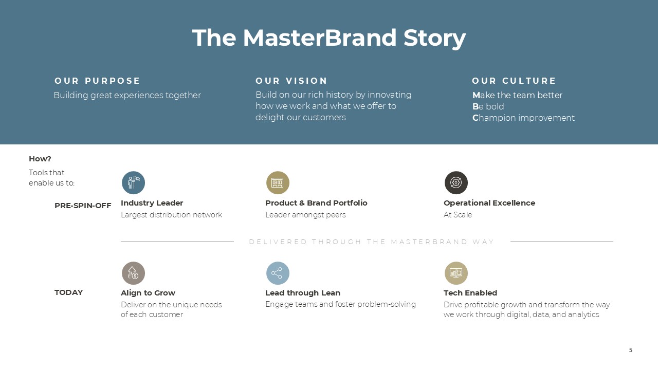The MasterBrand Story  Building great experiences together  OUR PURPOSE  How?  Tools that enable us to:  Lead through Lean  Engage teams and foster problem-solving  Align to Grow  Deliver on the unique needs of each customer  Tech Enabled  Drive profitable growth and transform the way we work through digital, data, and analytics  DELIVERED THROUGH THE MASTERBRAND WAY  Build on our rich history by innovating how we work and what we offer to delight our customers  OUR VISION  Make the team better  Be boldChampion improvement  OUR CULTURE  5  PRE-SPIN-OFF  TODAY  Industry Leader  Largest distribution network  Product & Brand Portfolio  Leader amongst peers  Operational Excellence  At Scale