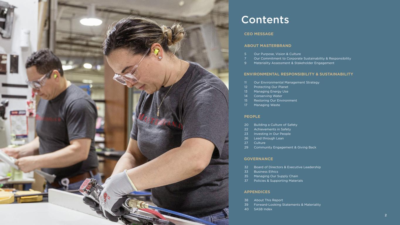 5 Our Purpose, Vision & Culture 7 Our Commitment to Corporate Sustainability & Responsibility 9 Materiality Assessment & Stakeholder Engagement 38 About This Report 39 Forward-Looking Statements & Materiality 40 SASB Index 20 Building a Culture of Safety 22 Achievements in Safety 23 Investing in Our People 26 Lead through Lean 27 Culture 29 Community Engagement & Giving Back 11 Our Environmental Management Strategy 12 Protecting Our Planet 13 Managing Energy Use 14 Conserving Water 15 Restoring Our Environment 17 Managing Waste 32 Board of Directors & Executive Leadership 33 Business Ethics 35 Managing Our Supply Chain 37 Policies & Supporting Materials Contents CEO MESSAGE 2 ABOUT MASTERBRAND ENVIRONMENTAL RESPONSIBILITY & SUSTAINABILITY PEOPLE GOVERNANCE APPENDICES