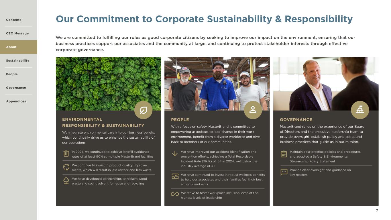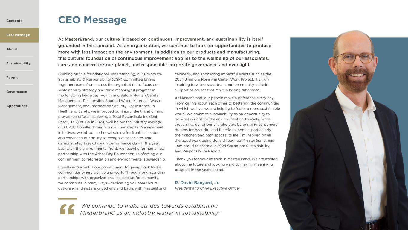 3 CEO Message At MasterBrand, our culture is based on continuous improvement, and sustainability is itself grounded in this concept. As an organization, we continue to look for opportunities to produce more with less impact on the environment. In addition to our products and manufacturing, this cultural foundation of continuous improvement applies to the wellbeing of our associates, care and concern for our planet, and responsible corporate governance and oversight. Building on this foundational understanding, our Corporate Sustainability & Responsibility (CSR) Committee brings together teams from across the organization to focus our sustainability strategy and drive meaningful progress in the following key areas: Health and Safety, Human Capital Management, Responsibly Sourced Wood Materials, Waste Management, and Information Security. For instance, in Health and Safety, we improved our injury identification and prevention efforts, achieving a Total Recordable Incident Rate (TRIR) of .64 in 2024, well below the industry average of 3.1. Additionally, through our Human Capital Management initiatives, we introduced new training for frontline leaders and enhanced our ability to recognize associates who demonstrated breakthrough performance during the year. Lastly, on the environmental front, we recently formed a new partnership with the Arbor Day Foundation, reinforcing our commitment to reforestation and environmental stewardship. Equally important is our commitment to giving back to the communities where we live and work. Through long-standing partnerships with organizations like Habitat for Humanity, we contribute in many ways—dedicating volunteer hours, designing and installing kitchens and baths with MasterBrand cabinetry, and sponsoring impactful events such as the 2024 Jimmy & Rosalynn Carter Work Project. It’s truly inspiring to witness our team and community unite in support of causes that make a lasting difference. At MasterBrand, our people make a difference every day. From caring about each other to bettering the communities in which we live, we are helping to foster a more sustainable world. We embrace sustainability as an opportunity to do what is right for the environment and society, while creating value for our shareholders by bringing consumers’ dreams for beautiful and functional homes, particularly their kitchen and bath spaces, to life. I’m inspired by all the good work being done throughout MasterBrand, and I am proud to share our 2024 Corporate Sustainability and Responsibility Report. Thank you for your interest in MasterBrand. We are excited about the future and look forward to making meaningful progress in the years ahead. R. David Banyard, Jr. President and Chief Executive Officer We continue to make strides towards establishing MasterBrand as an industry leader in sustainability.”“ Contents CEO Message About Sustainability Governance Appendices People