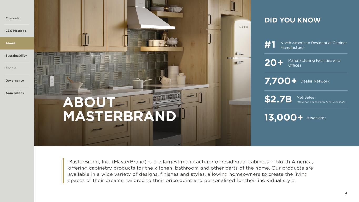 4 ABOUT MASTERBRAND MasterBrand, Inc. (MasterBrand) is the largest manufacturer of residential cabinets in North America, offering cabinetry products for the kitchen, bathroom and other parts of the home. Our products are available in a wide variety of designs, finishes and styles, allowing homeowners to create the living spaces of their dreams, tailored to their price point and personalized for their individual style. DID YOU KNOW North American Residential Cabinet Manufacturer #1 20+ 7,700+ $2.7B 13,000+ Manufacturing Facilities and Offices Dealer Network Net Sales (Based on net sales for fiscal year 2024) Associates Contents CEO Message About Sustainability Governance Appendices People