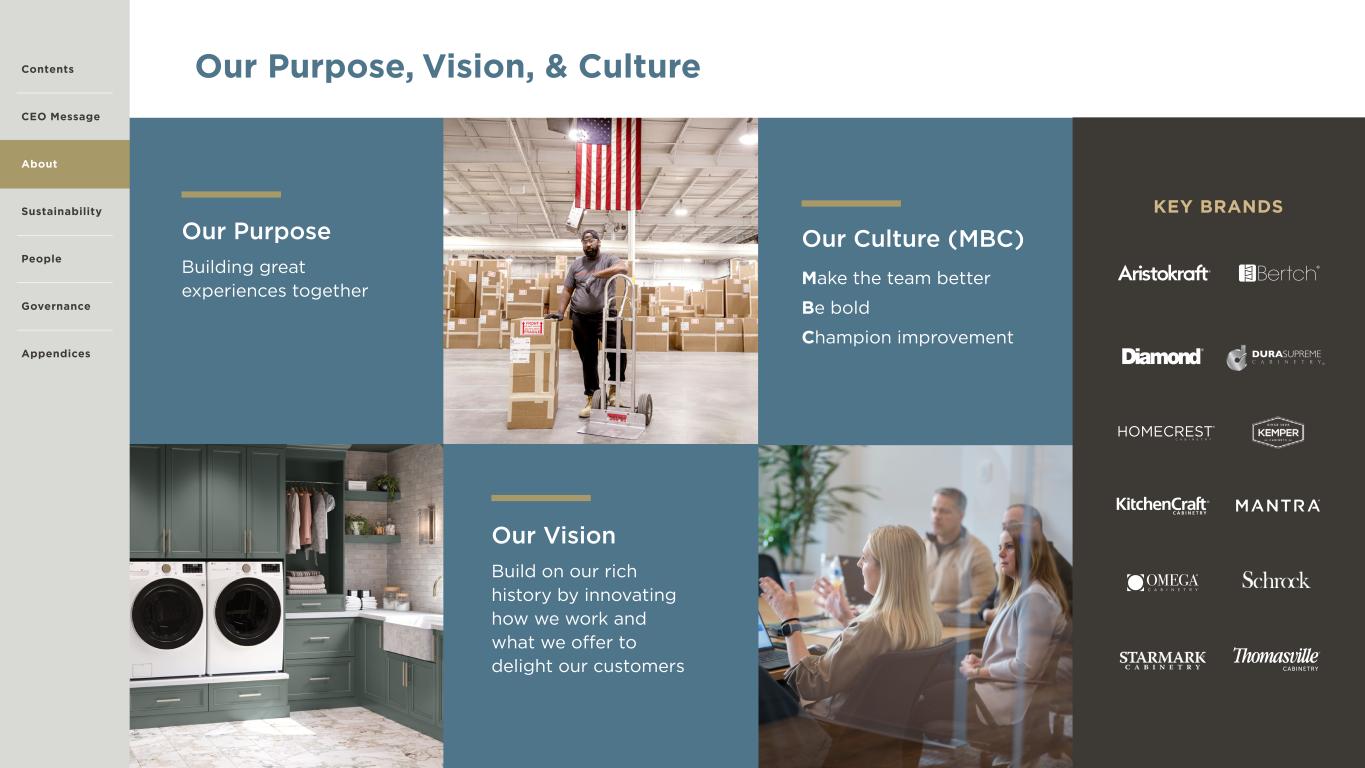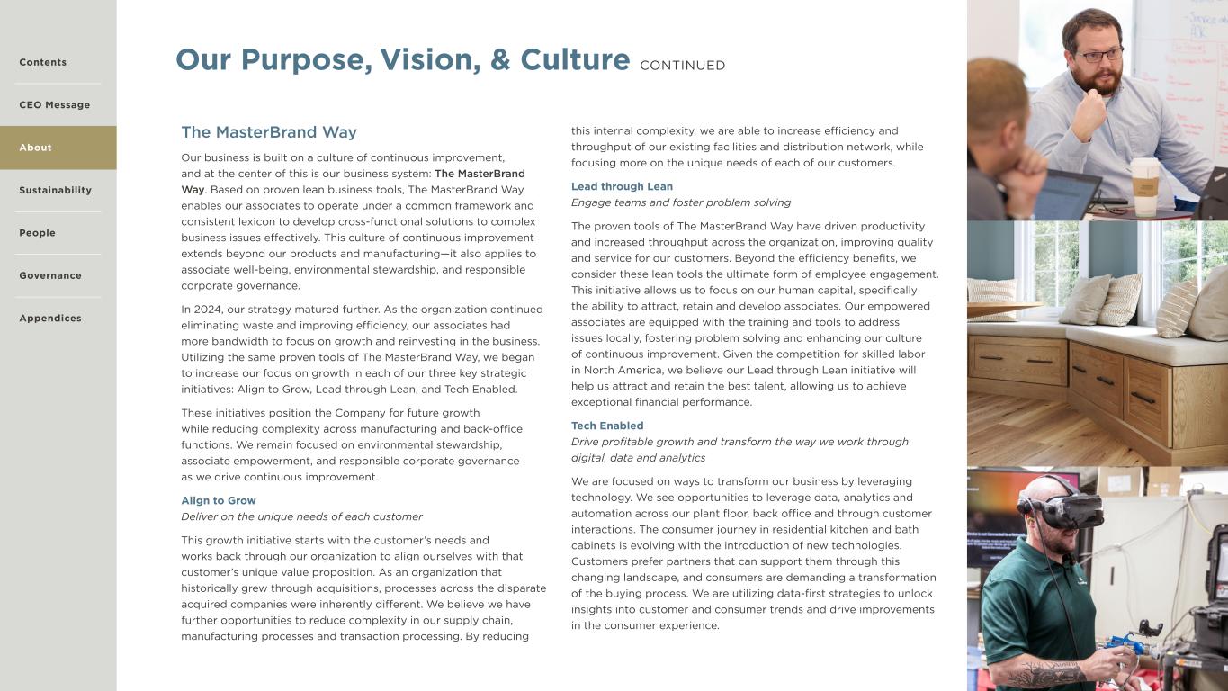 6 The MasterBrand Way Our business is built on a culture of continuous improvement, and at the center of this is our business system: The MasterBrand Way. Based on proven lean business tools, The MasterBrand Way enables our associates to operate under a common framework and consistent lexicon to develop cross-functional solutions to complex business issues effectively. This culture of continuous improvement extends beyond our products and manufacturing—it also applies to associate well-being, environmental stewardship, and responsible corporate governance. In 2024, our strategy matured further. As the organization continued eliminating waste and improving efficiency, our associates had more bandwidth to focus on growth and reinvesting in the business. Utilizing the same proven tools of The MasterBrand Way, we began to increase our focus on growth in each of our three key strategic initiatives: Align to Grow, Lead through Lean, and Tech Enabled. These initiatives position the Company for future growth while reducing complexity across manufacturing and back-office functions. We remain focused on environmental stewardship, associate empowerment, and responsible corporate governance as we drive continuous improvement. Align to Grow Deliver on the unique needs of each customer This growth initiative starts with the customer’s needs and works back through our organization to align ourselves with that customer’s unique value proposition. As an organization that historically grew through acquisitions, processes across the disparate acquired companies were inherently different. We believe we have further opportunities to reduce complexity in our supply chain, manufacturing processes and transaction processing. By reducing this internal complexity, we are able to increase efficiency and throughput of our existing facilities and distribution network, while focusing more on the unique needs of each of our customers. Lead through Lean Engage teams and foster problem solving The proven tools of The MasterBrand Way have driven productivity and increased throughput across the organization, improving quality and service for our customers. Beyond the efficiency benefits, we consider these lean tools the ultimate form of employee engagement. This initiative allows us to focus on our human capital, specifically the ability to attract, retain and develop associates. Our empowered associates are equipped with the training and tools to address issues locally, fostering problem solving and enhancing our culture of continuous improvement. Given the competition for skilled labor in North America, we believe our Lead through Lean initiative will help us attract and retain the best talent, allowing us to achieve exceptional financial performance. Tech Enabled Drive profitable growth and transform the way we work through digital, data and analytics We are focused on ways to transform our business by leveraging technology. We see opportunities to leverage data, analytics and automation across our plant floor, back office and through customer interactions. The consumer journey in residential kitchen and bath cabinets is evolving with the introduction of new technologies. Customers prefer partners that can support them through this changing landscape, and consumers are demanding a transformation of the buying process. We are utilizing data-first strategies to unlock insights into customer and consumer trends and drive improvements in the consumer experience. Our Purpose, Vision, & Culture CONTINUEDContents CEO Message About Sustainability Governance Appendices People