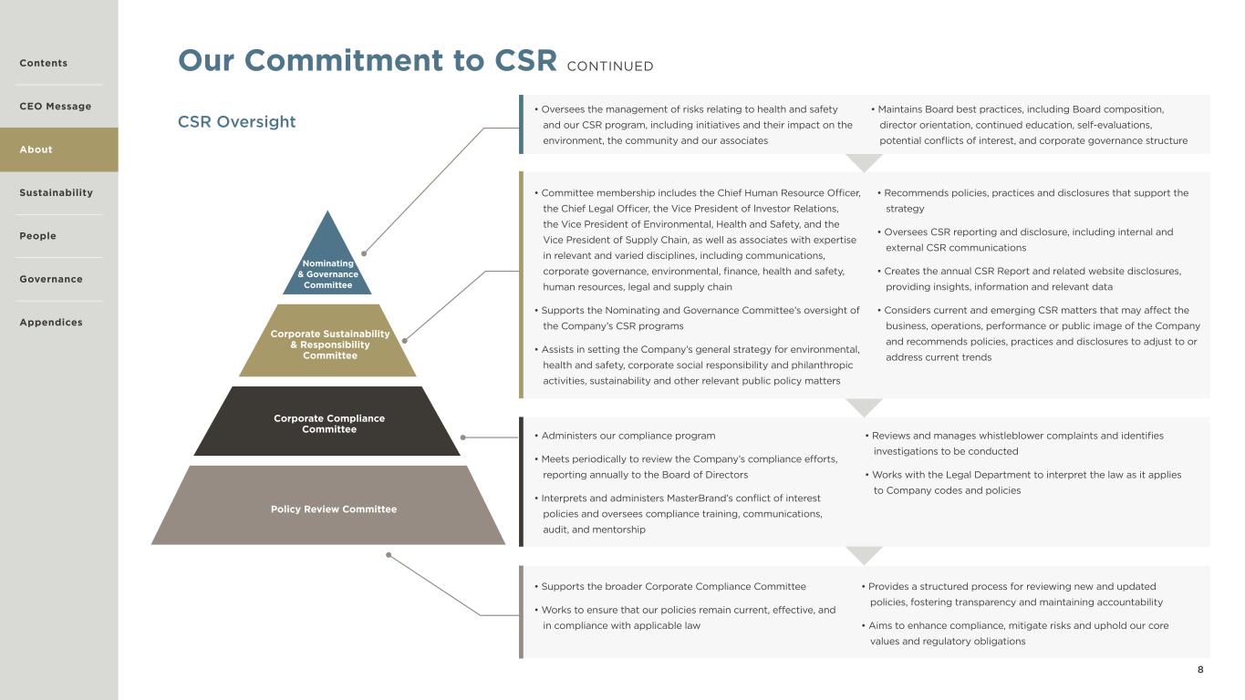 8 Our Commitment to CSR CONTINUED CSR Oversight Corporate Sustainability & Responsibility Committee Corporate Compliance Committee Policy Review Committee Nominating & Governance Committee • Oversees the management of risks relating to health and safety and our CSR program, including initiatives and their impact on the environment, the community and our associates • Maintains Board best practices, including Board composition, director orientation, continued education, self-evaluations, potential conflicts of interest, and corporate governance structure • Committee membership includes the Chief Human Resource Officer, the Chief Legal Officer, the Vice President of lnvestor Relations, the Vice President of Environmental, Health and Safety, and the Vice President of Supply Chain, as well as associates with expertise in relevant and varied disciplines, including communications, corporate governance, environmental, finance, health and safety, human resources, legal and supply chain • Supports the Nominating and Governance Committee’s oversight of the Company’s CSR programs • Assists in setting the Company’s general strategy for environmental, health and safety, corporate social responsibility and philanthropic activities, sustainability and other relevant public policy matters • Recommends policies, practices and disclosures that support the strategy • Oversees CSR reporting and disclosure, including internal and external CSR communications • Creates the annual CSR Report and related website disclosures, providing insights, information and relevant data • Considers current and emerging CSR matters that may affect the business, operations, performance or public image of the Company and recommends policies, practices and disclosures to adjust to or address current trends • Administers our compliance program • Meets periodically to review the Company’s compliance efforts, reporting annually to the Board of Directors • Interprets and administers MasterBrand’s conflict of interest policies and oversees compliance training, communications, audit, and mentorship • Reviews and manages whistleblower complaints and identifies investigations to be conducted • Works with the Legal Department to interpret the law as it applies to Company codes and policies • Supports the broader Corporate Compliance Committee • Works to ensure that our policies remain current, effective, and in compliance with applicable law • Provides a structured process for reviewing new and updated policies, fostering transparency and maintaining accountability • Aims to enhance compliance, mitigate risks and uphold our core values and regulatory obligations Contents CEO Message About Sustainability Governance Appendices People