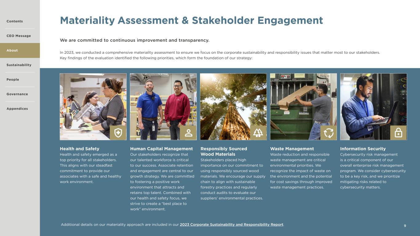 Contents CEO Message About Sustainability Governance Appendices 9 Materiality Assessment & Stakeholder Engagement We are committed to continuous improvement and transparency. In 2023, we conducted a comprehensive materiality assessment to ensure we focus on the corporate sustainability and responsibility issues that matter most to our stakeholders. Key findings of the evaluation identified the following priorities, which form the foundation of our strategy: Additional details on our materiality approach are included in our 2023 Corporate Sustainability and Responsibility Report. Health and Safety Health and safety emerged as a top priority for all stakeholders. This aligns with our steadfast commitment to provide our associates with a safe and healthy work environment. Human Capital Management Our stakeholders recognize that our talented workforce is critical to our success. Associate retention and engagement are central to our growth strategy. We are committed to fostering a positive work environment that attracts and retains top talent. Combined with our health and safety focus, we strive to create a “best place to work” environment. Responsibly Sourced Wood Materials Stakeholders placed high importance on our commitment to using responsibly sourced wood materials. We encourage our supply chain to align with sustainable forestry practices and regularly conduct audits to evaluate our suppliers’ environmental practices. Waste Management Waste reduction and responsible waste management are critical environmental priorities. We recognize the impact of waste on the environment and the potential for cost savings through improved waste management practices. Information Security Cybersecurity risk management is a critical component of our overall enterprise risk management program. We consider cybersecurity to be a key risk, and we prioritize mitigating risks related to cybersecurity matters. People
